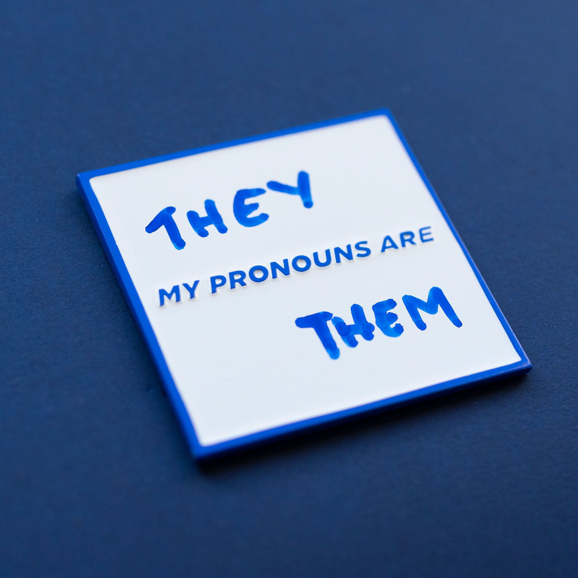 She, they, xe, he? Whatever your pronouns, wear them with pride! Write in your own pronouns using a marker with this customisable enamel pin.