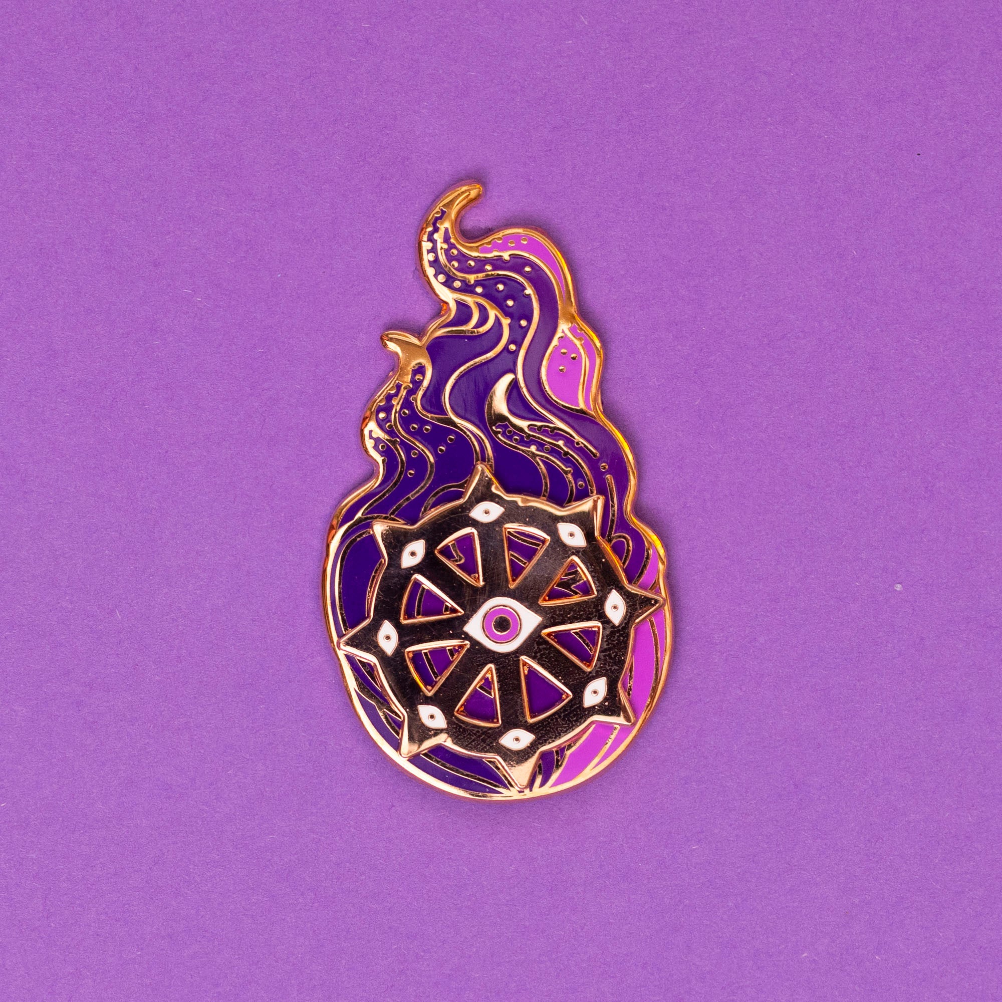 Flaming Wheel is available in red with gold plating; purple with rose gold plating; or teal with black nickel plating.