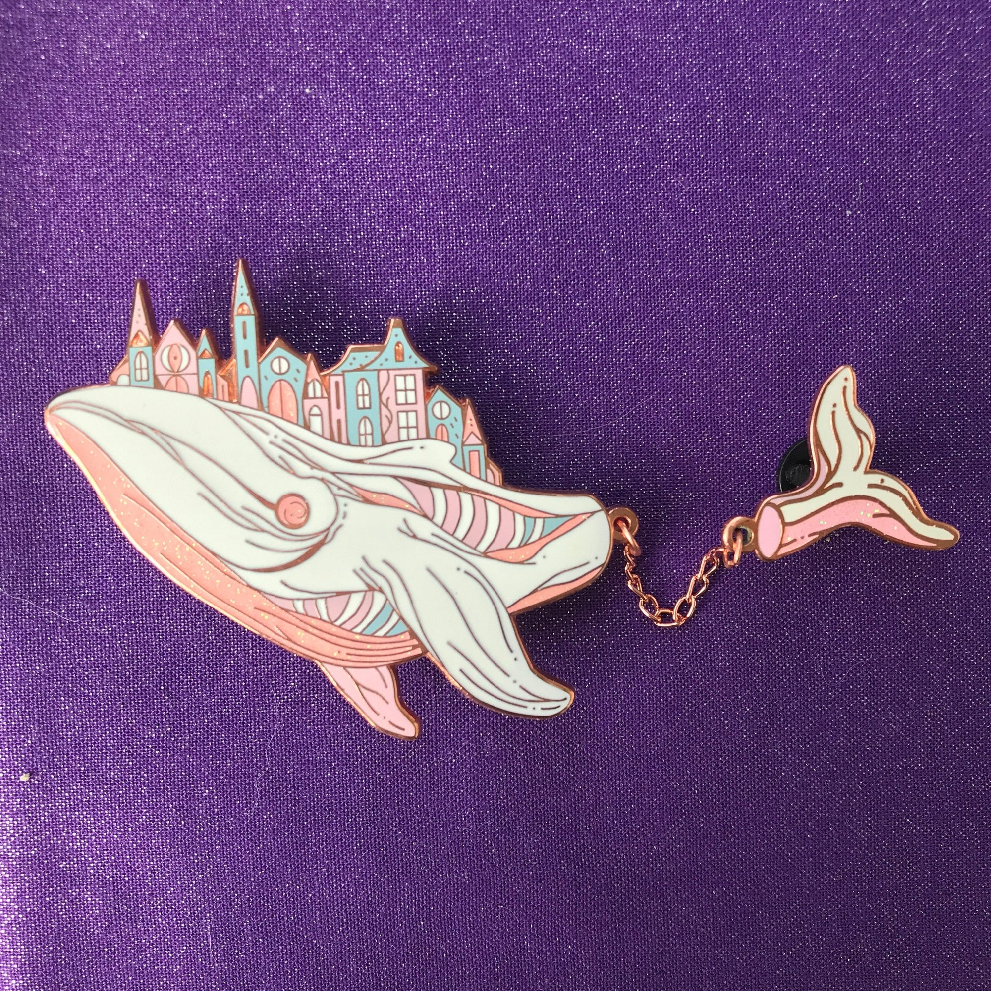 The pin consists of two parts, connected by a chain. The whale body is approximately 2.5 inches (6 cm) long, while the tail is about an inch long (2.5 cm). The pin has hard enamel and recessed metal detailing. It has two pinbacks with rubber clutches on the whale body, and one pinback on the tail.  This variant has rose gold plating and glitter accents.