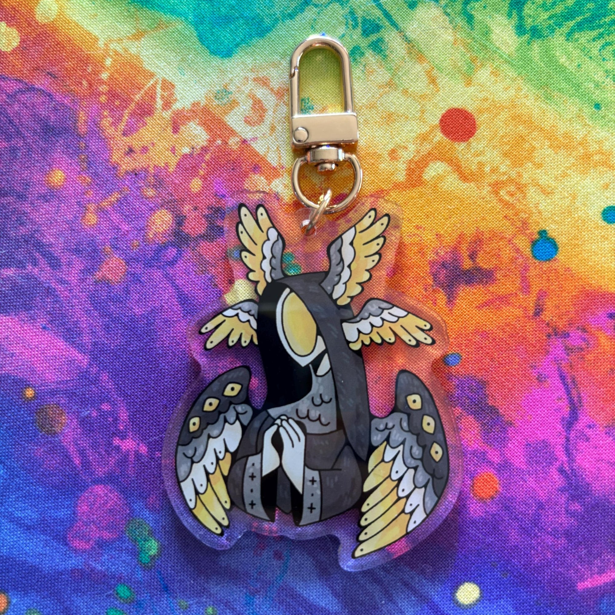 This acrylic keychain is 2.5 inches (6.3 cm) on the longest side, double-sided with the same print on both sides; it has a gun metal lobster clasp.