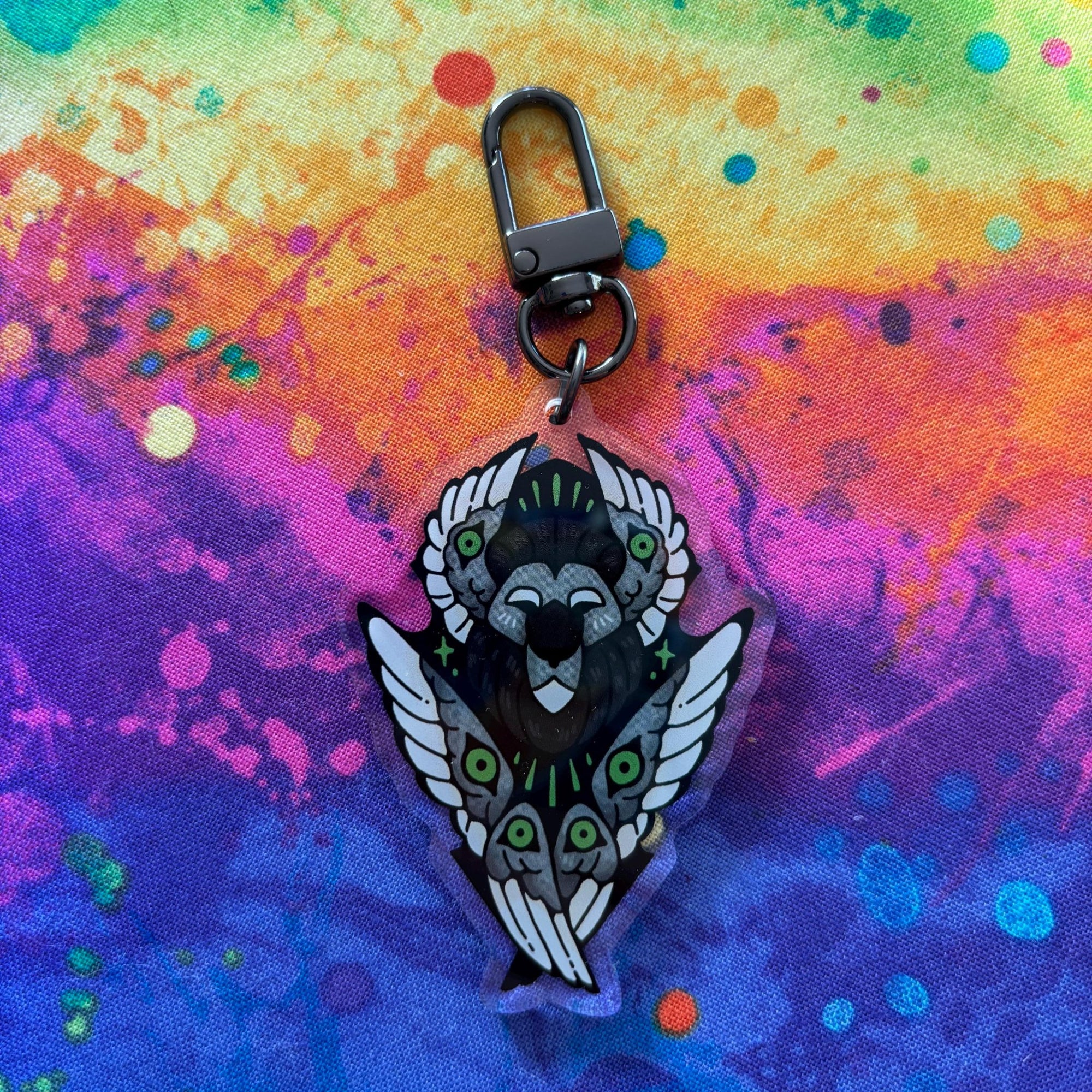 | This acrylic keychain is 2.5 inches (6.3 cm) on the longest side, double-sided with the same print on both sides; it has a gun metal lobster clasp. |