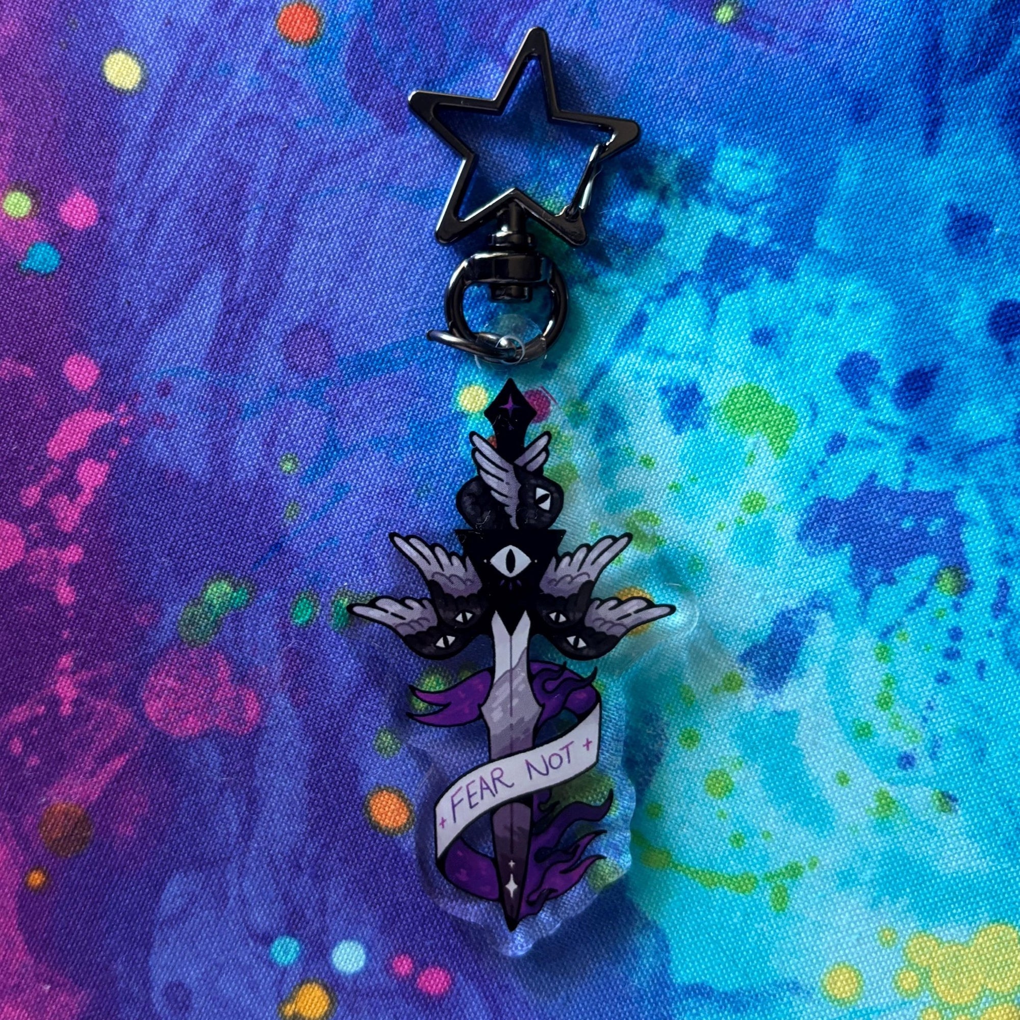 | This acrylic keychain is 2.5 inches (6.3 cm) on the longest side, double-sided with the same print on both sides; it has a gun metal star clasp. |