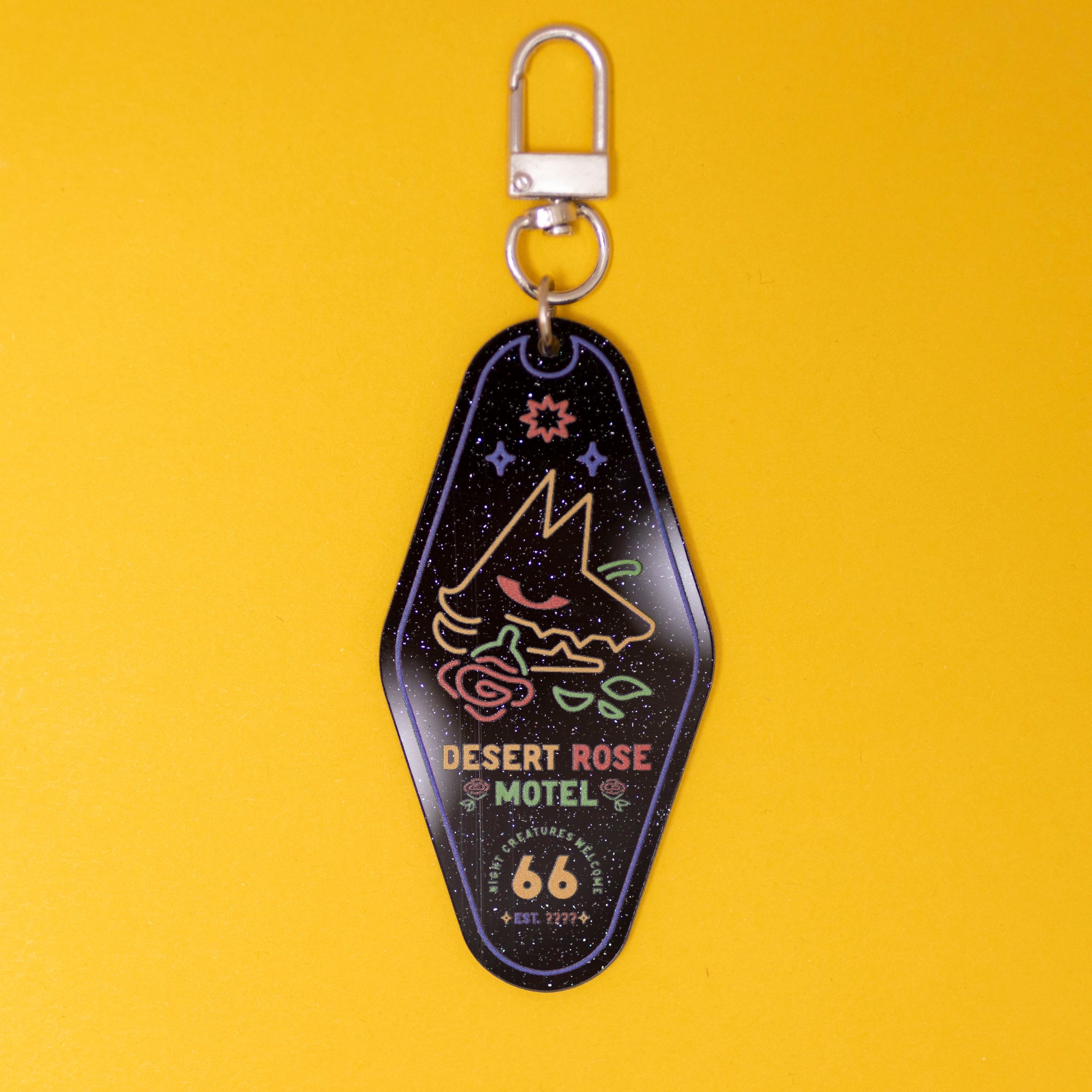 All night creatures welcome! These motel-styled keychains are printed onto a high-quality sparkling black acrylic, with a sturdy metal clasp. Hang this onto a backpack or keys to add a little flair!