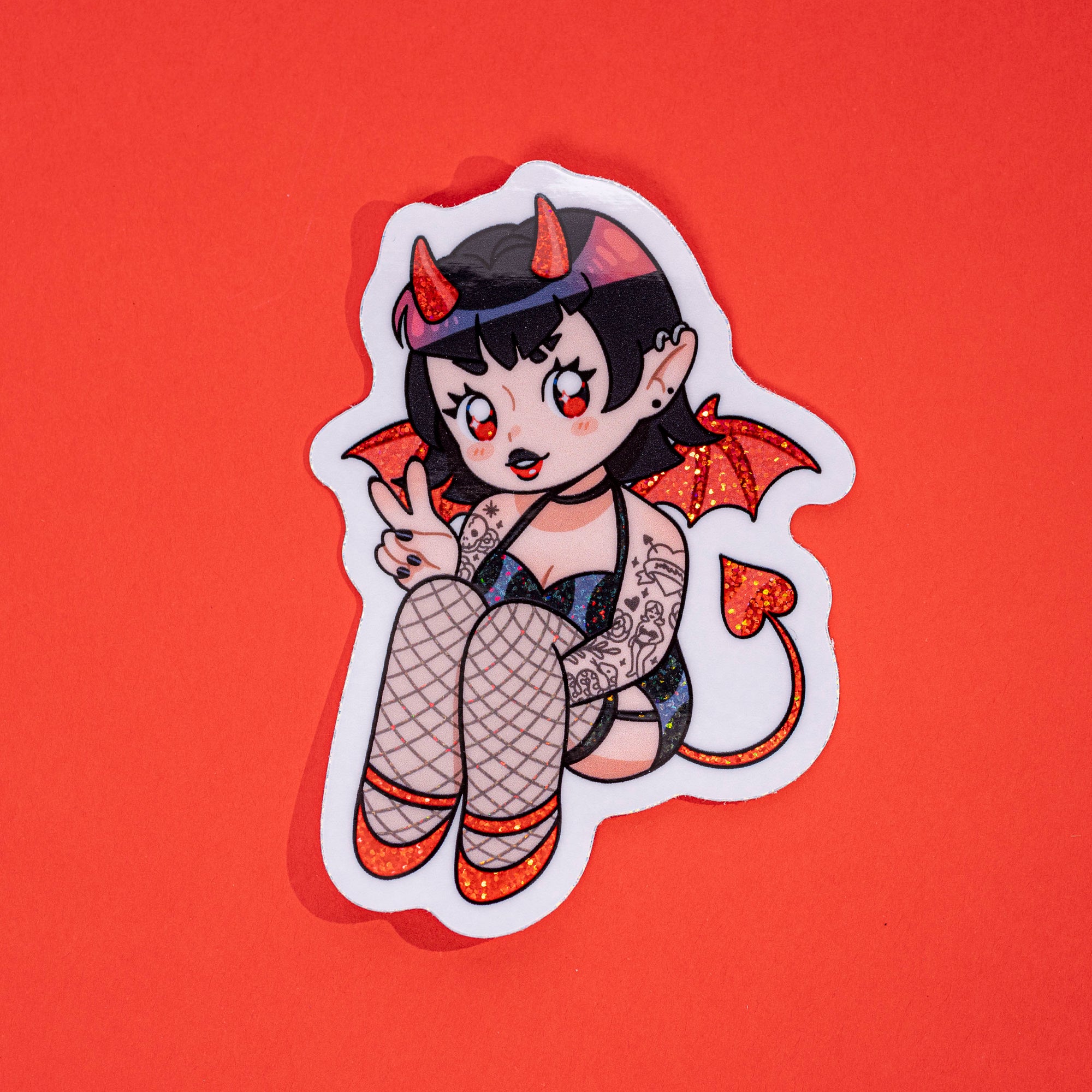 This devil sticker 3” tall and has a holographic glitter finish. These stickers are perfect for decorating your laptop, water bottle, journal, and more!