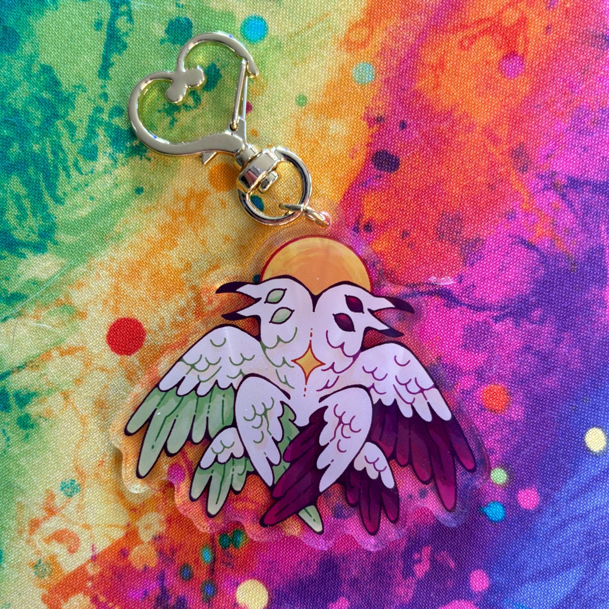 This acrylic keychain is 2.5 inches (6.3 cm) on the longest side, double-sided with the same print on both sides; it has a gold heart clasp.
