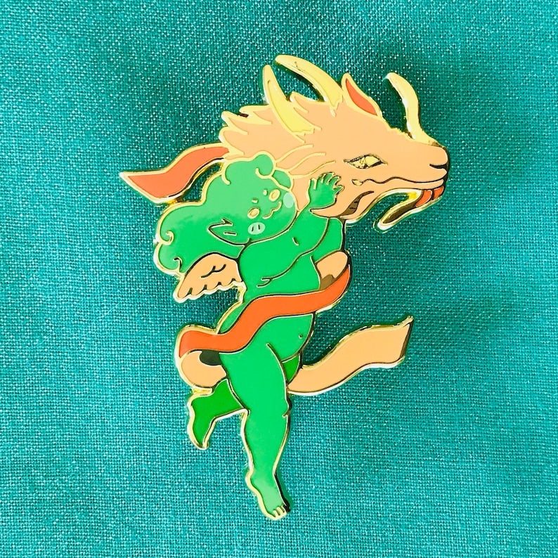 A little putto (cherub) for the Year of the Dragon.Each pin is about 2 inches (5 cm) long with gold plating and screenprint. They have two pin posts and rubber backings. This listing is for seconds grade pins only. They mostly have some specks in the plating on the horns; and small dents in the enamel. For my complete pin grading policy, please see my About & FAQ: linktr.ee/ultra.infinite