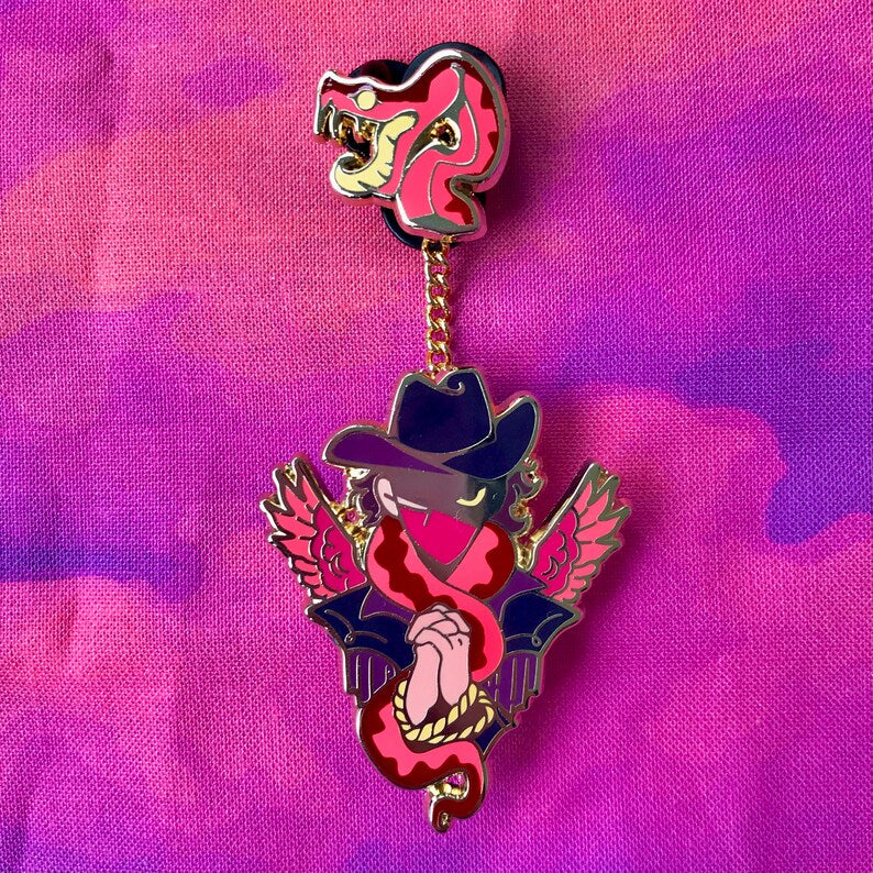 Eden, the snake in the garden. A conniving sweet-talker whose lies have finally caught up to them.This design is of my OC Eden, the snake and chain is meant to mimic a rope around their neck as they await their fate at the gallows! The chain is detachable so you can display the pins however you like.Each pin has two pin posts with rubber backings. The chain attaches to the pin posts on the back of the pins. The main pin is 1.8 inches (5 cm) long, the snake head is 0.7 in (1.8 cm). Each pin has gold plating, hard enamel, and screenprint. This listing is for standard grade pins only. Standard grade pins may have one or two tiny imperfections.