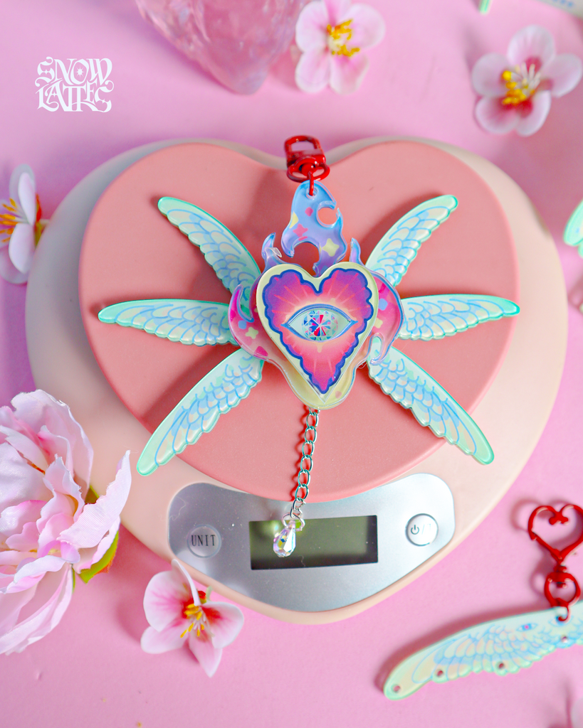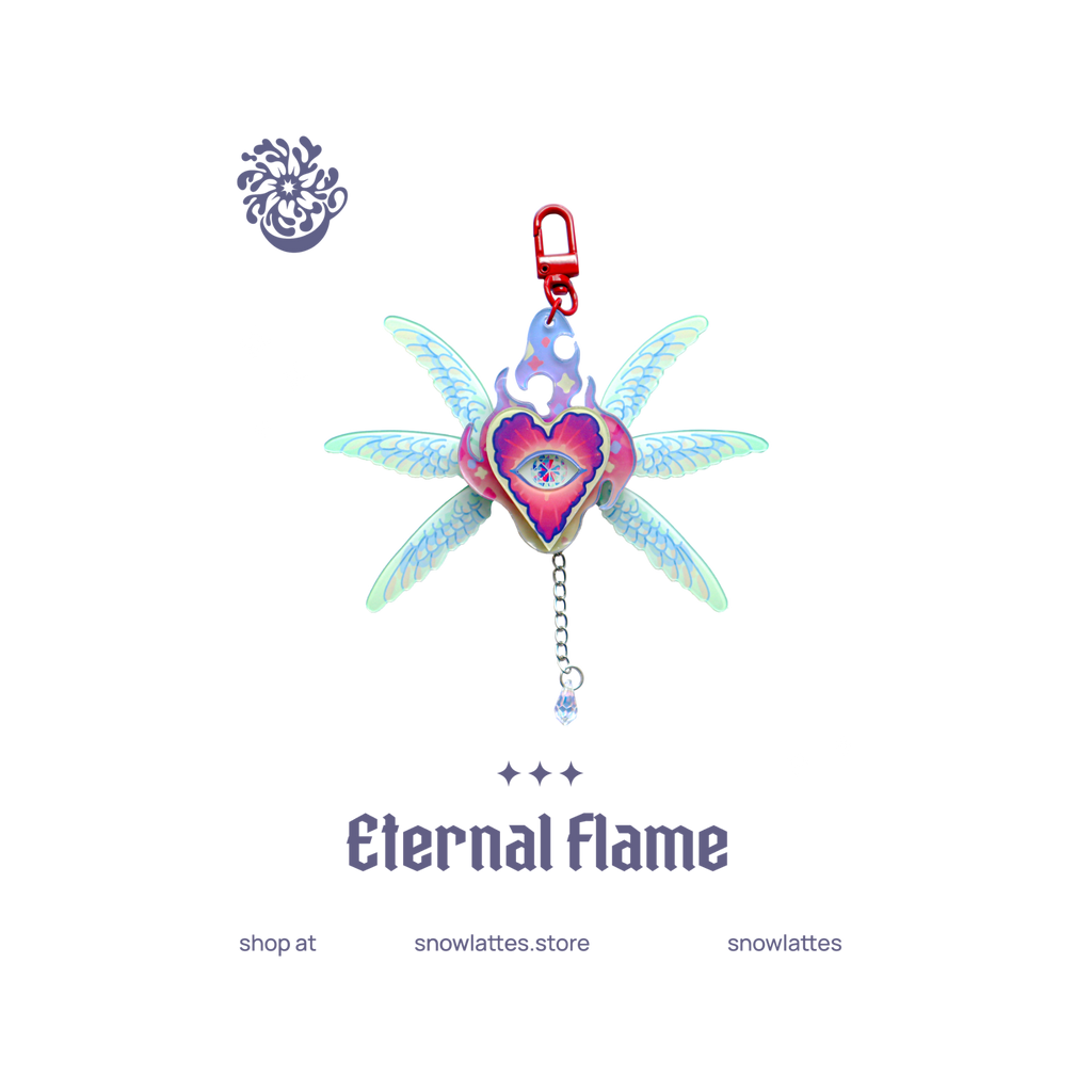 The Eternal Flame Interactive Charm is 13 x 13 cm (includes dangling crystal)in size. Its wings on the back are movable by pulling on the chains. Comes with a detachable heart piece that attaches on to the charm with a magnet, revealing a small heart-shaped photo holder inside for someone special.