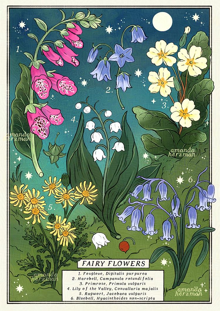 Fairy flowers is a bright illustration featuring flowers of fairy folklore. Fairy flowers are flowers associated with the fae folk that feature in myth and lore. This print lists the common and scientific names, and is A5 in size (14.8 x 21 cm).