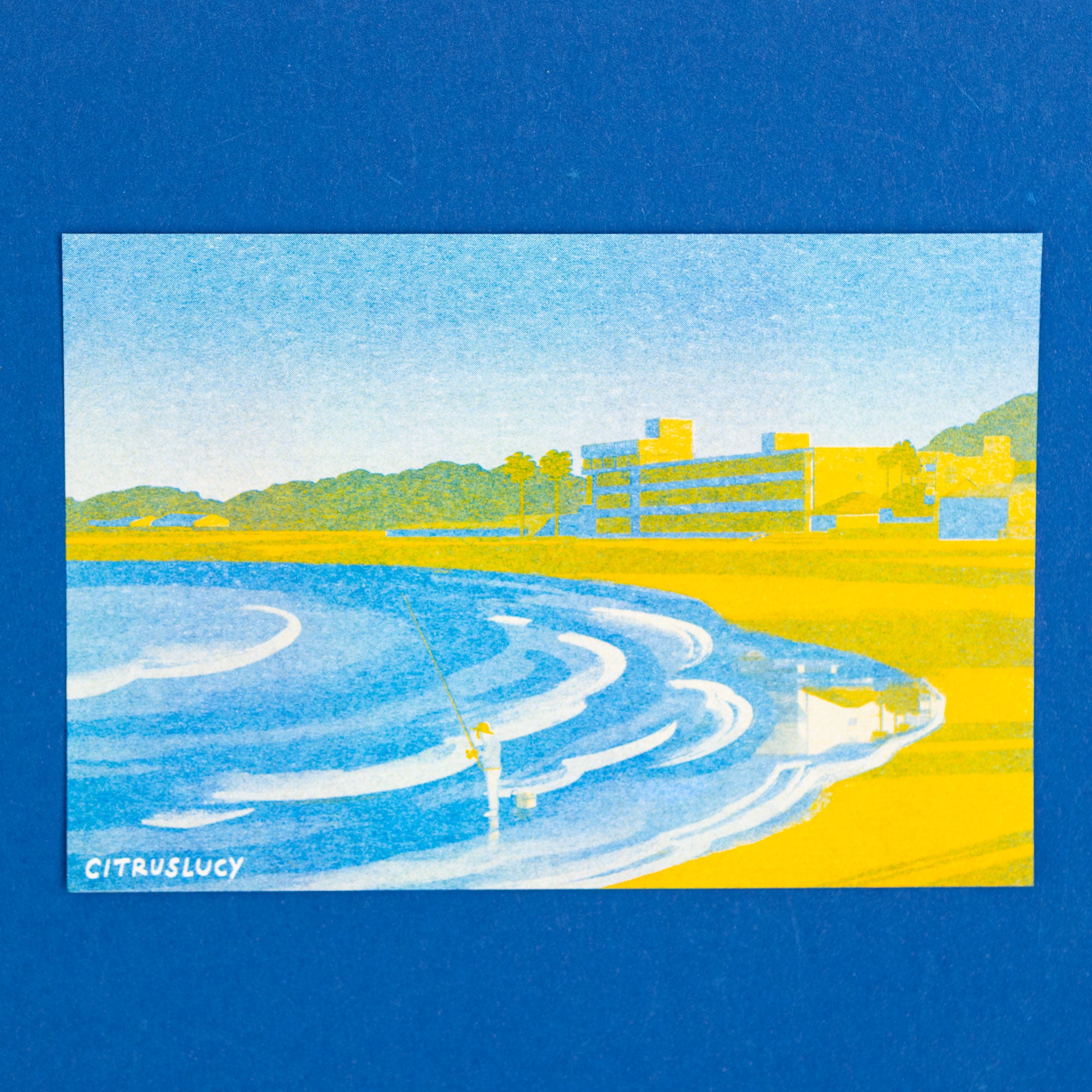 A fisherman waiting patiently on the shore in the late afternoon. Two colour risograph postcard, printed in Japan.