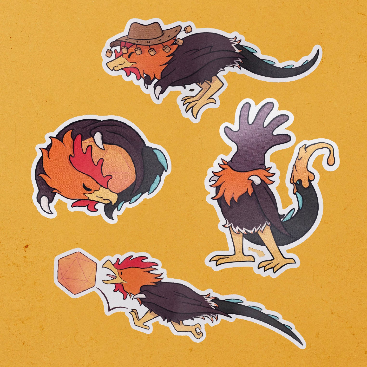 Some assorted stickers to accompany you and your hoard of dice! Fowl Creature Dice's mascot Cockatrice comes in 4 different stickers; Chasing Dice, Protecting Dice, Aussie Made or Hand Made. Grab all four together for an even cheeper deal!