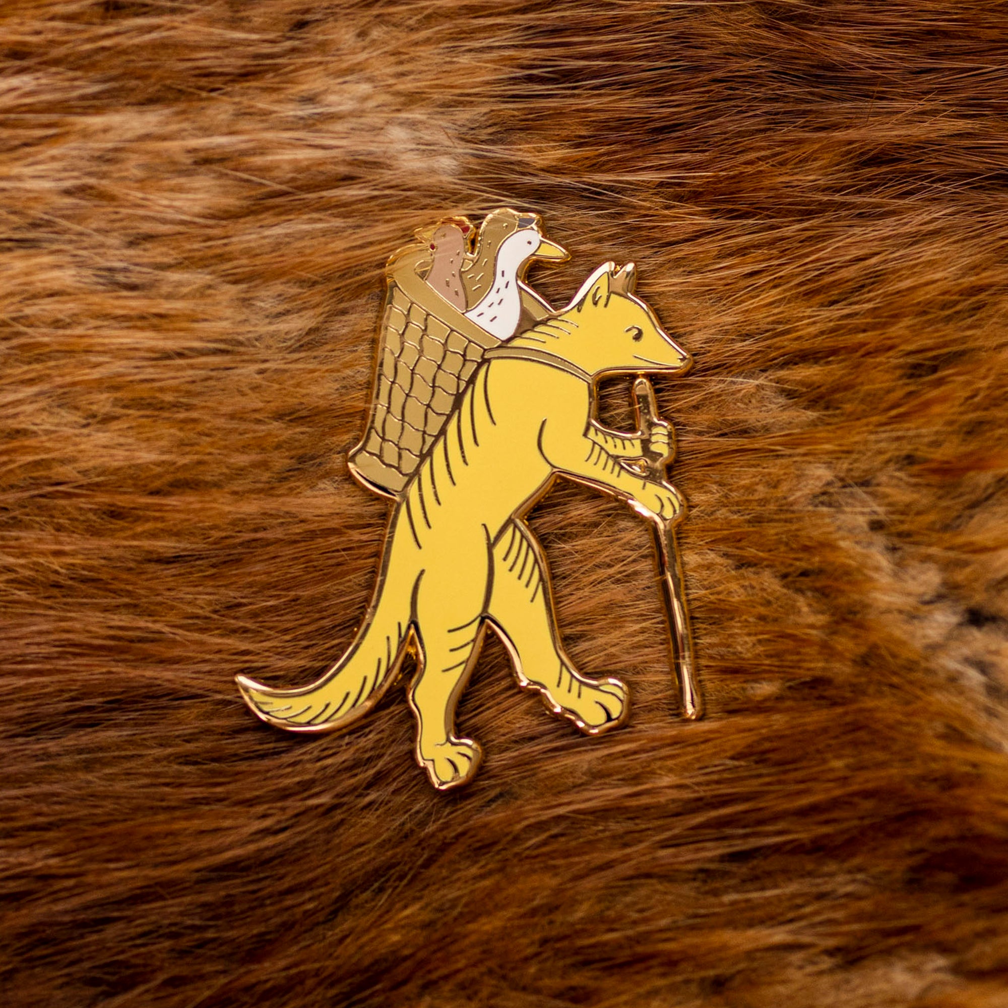 A wily fox makes his way home with a basket of fowl! Quite possibly a depiction of the sly folk hero, Reynard the Fox.