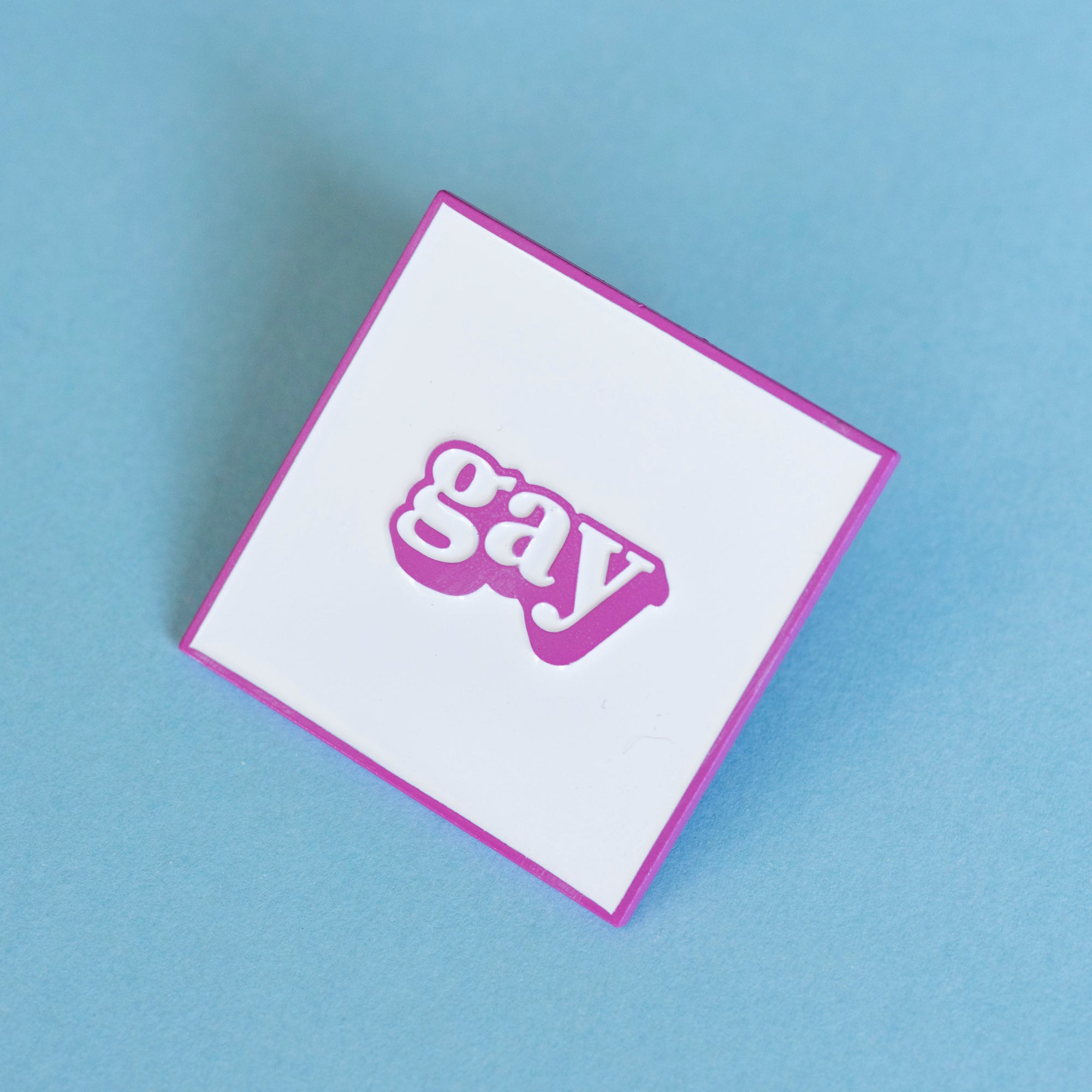 Get your gay on with this pastel pinkĀ enamel pin! White soft enamel fill on pinkĀ coated iron enamel pin.