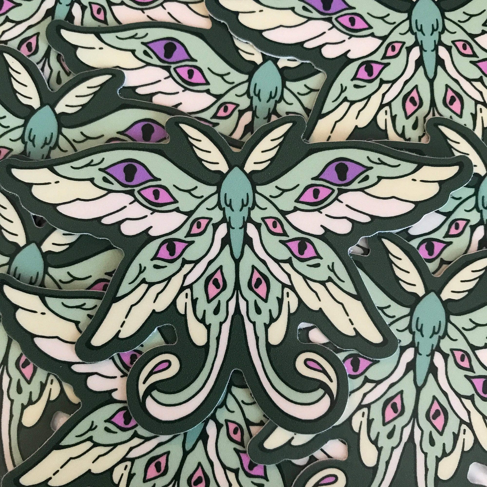 An angel inspired by the Luna Moth, for Genderfae pride.This sticker is approximately 3 inches (7.6 cm) on the longest side, and printed on matte vinyl.