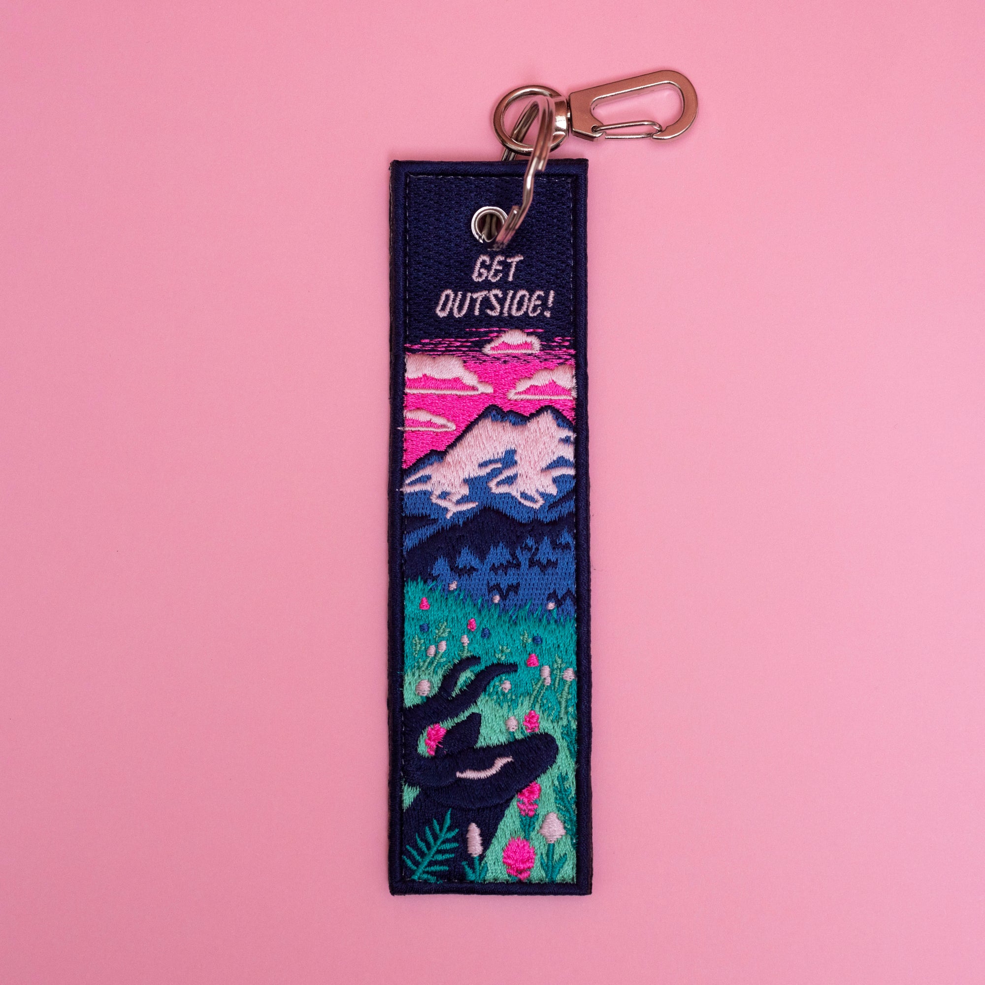 This twill embroidered keychain is double-sided, with regular and neon embroidery thread. It features a sturdy clasp and key ring that lets you clip it onto your bags, keys, or any item to add an extra flair!