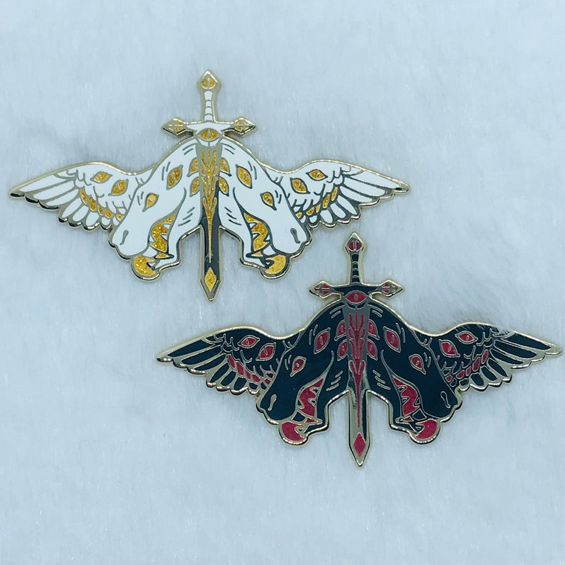 A two-headed angel of extinction.This pin is approximately 2.5 in (6.3 cm) wide. The pin has hard enamel with glitter accents, gold plating, and two pin posts with rubber clutches. Gorgonops is available in white or black.This listing is for standard grade pins only. Standard grade pins may have one or two tiny imperfections.