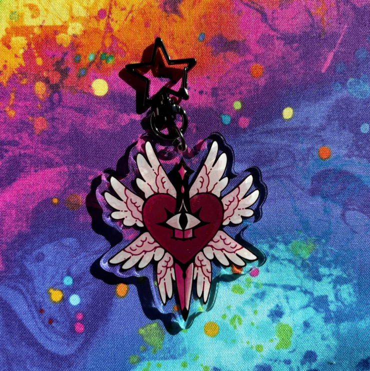This acrylic keychain is 2.5 inches (6.3 cm) long, double-sided with the same print on both sides.