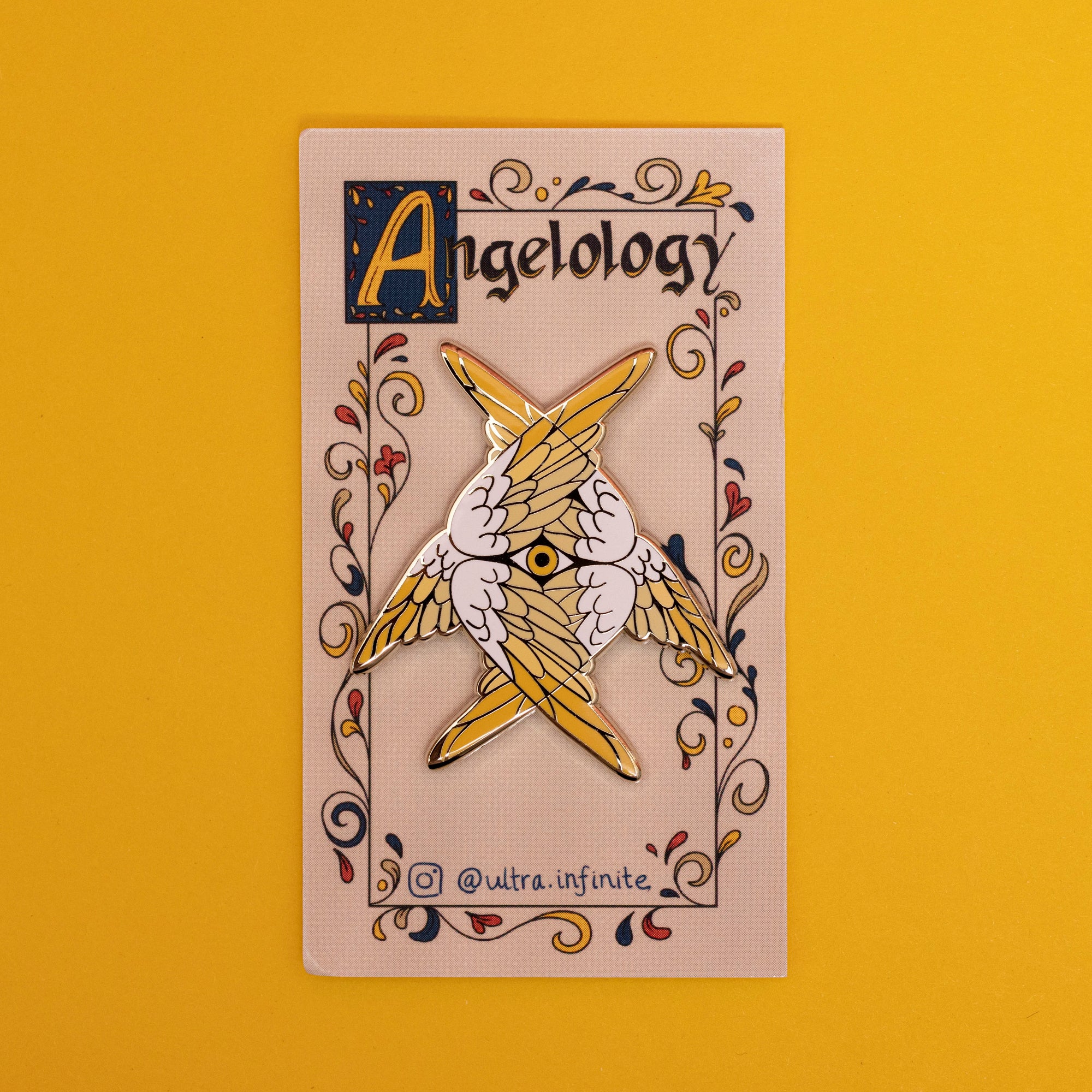 This pin is part of my angel-themed pin series, Angelology. A colorful guardian angel of love in all its forms, Heart Seraphim features wings folded into heart shapes and a single eye.