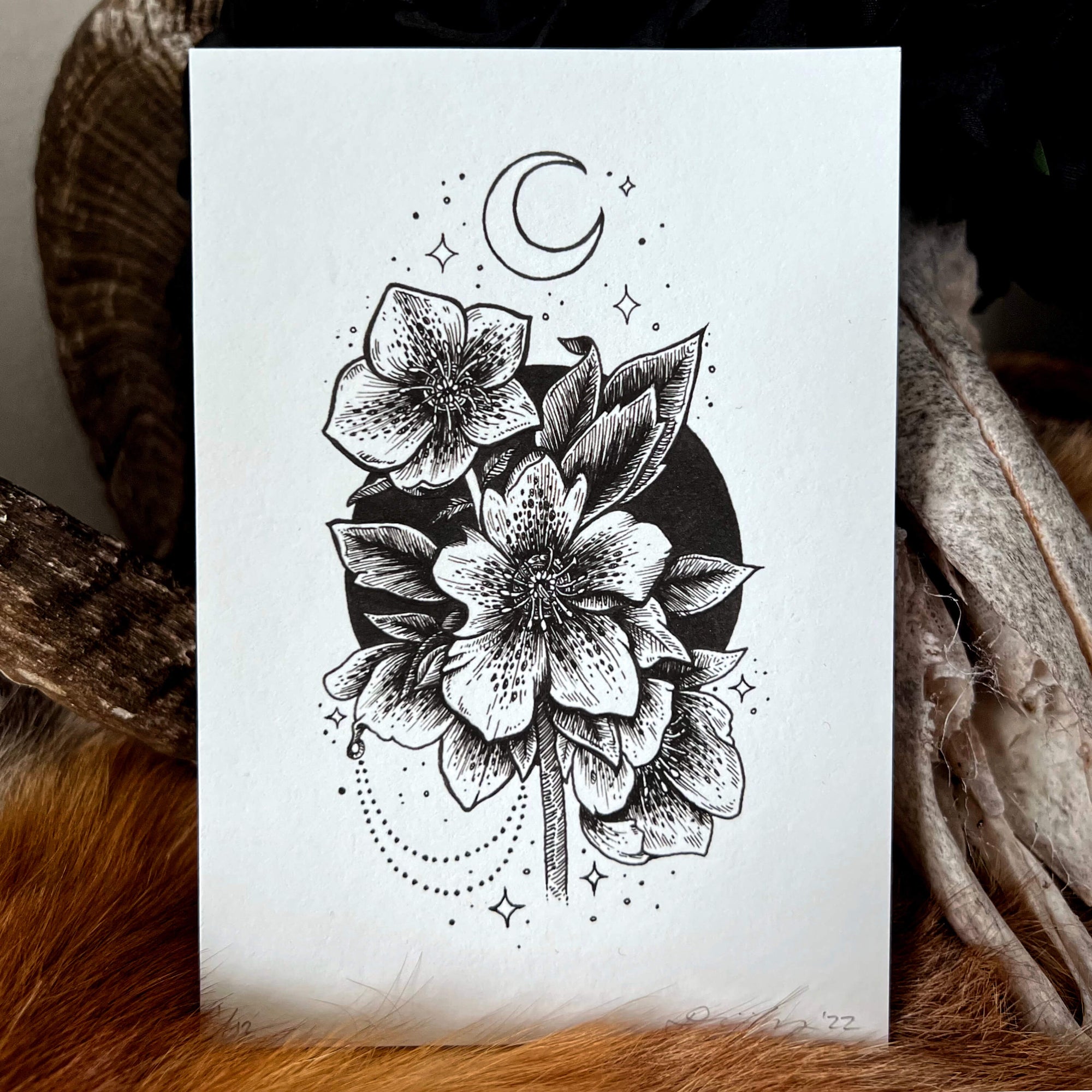 This fine art quality print depicts the beautiful (and poisonous) Hellebore adorned with shimmer and nocturnal magic.