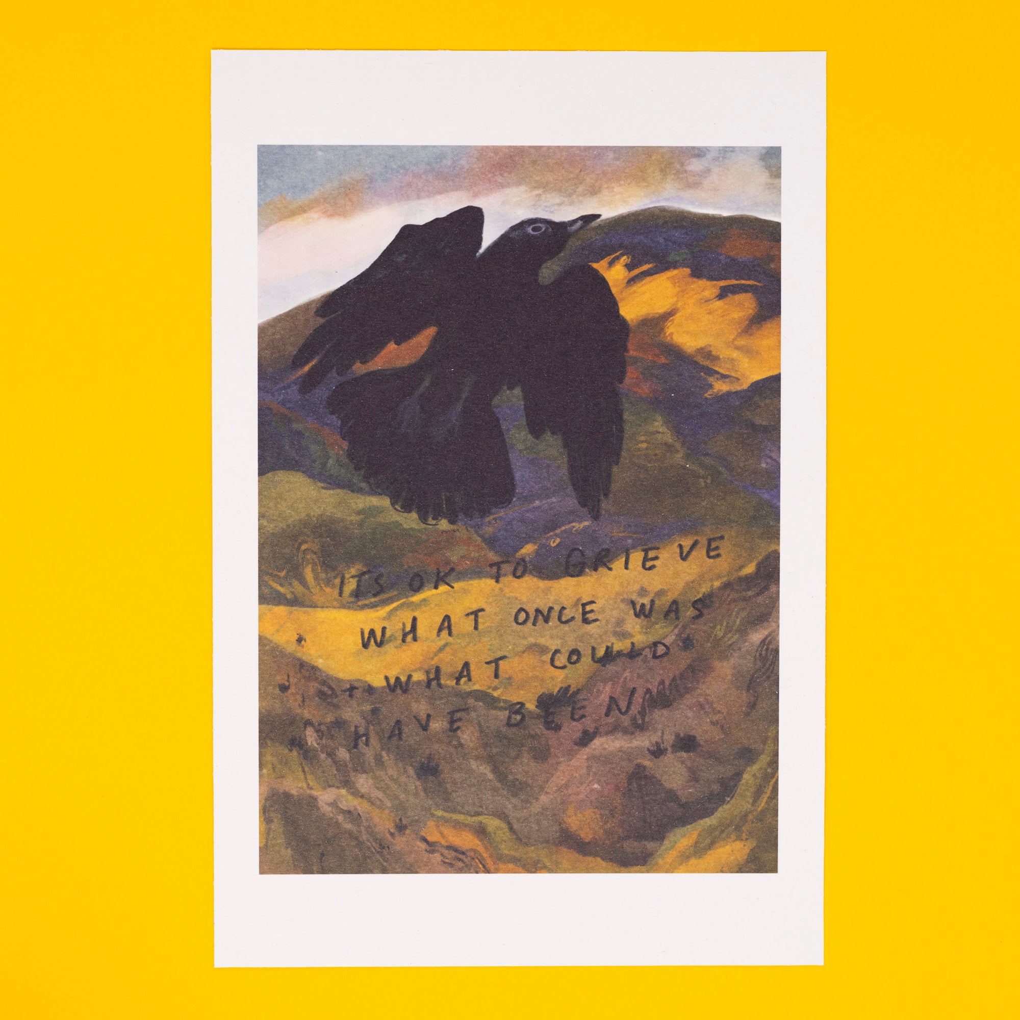 "its ok to grieve what once was + what could have been" featuring a raven amongst lush coloured fields.