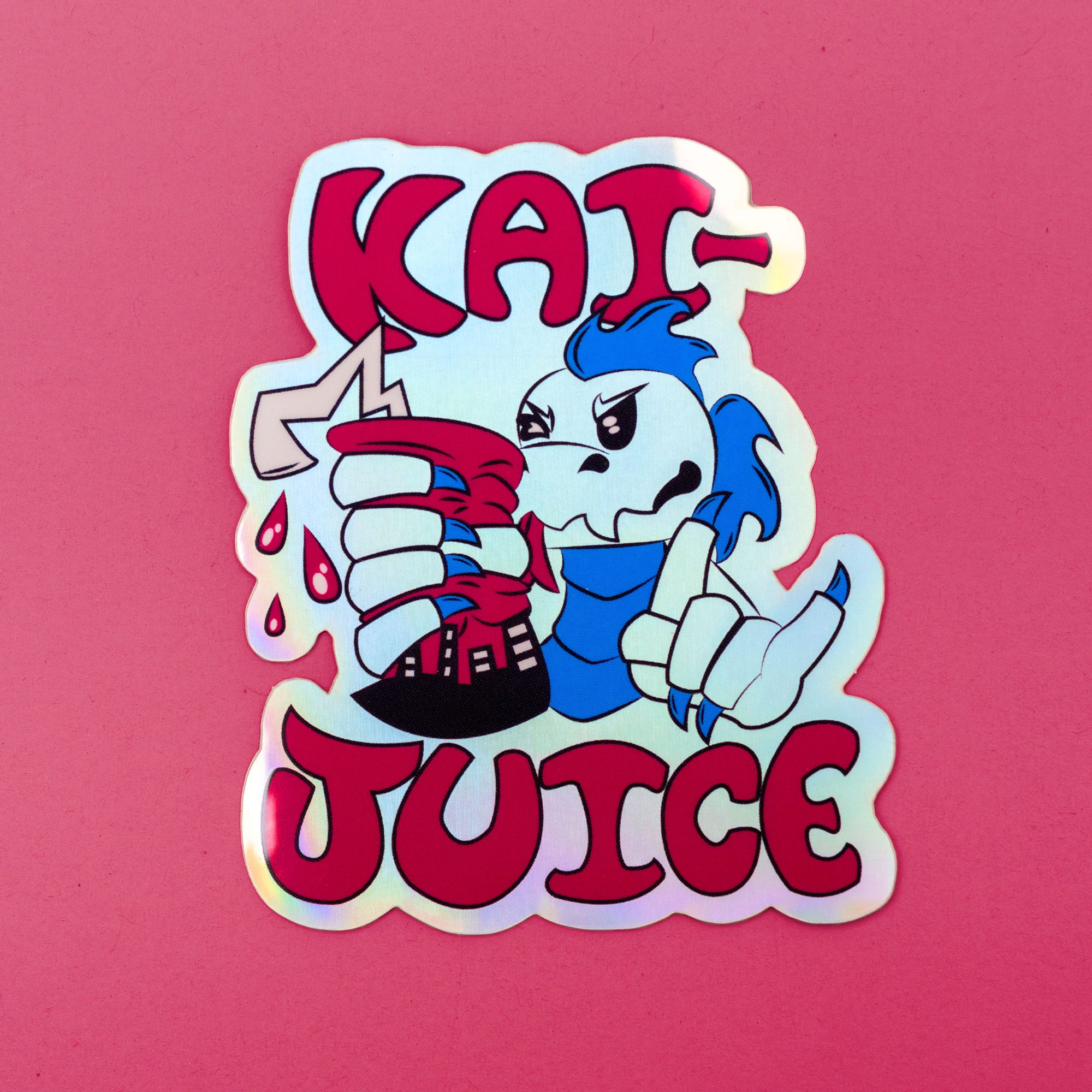 If you love kaiju, you'll love kai-juice! This fun play on words is featured on an amazingly rainbow holographic sticker. This design is also available on a screen printed t-shirt!