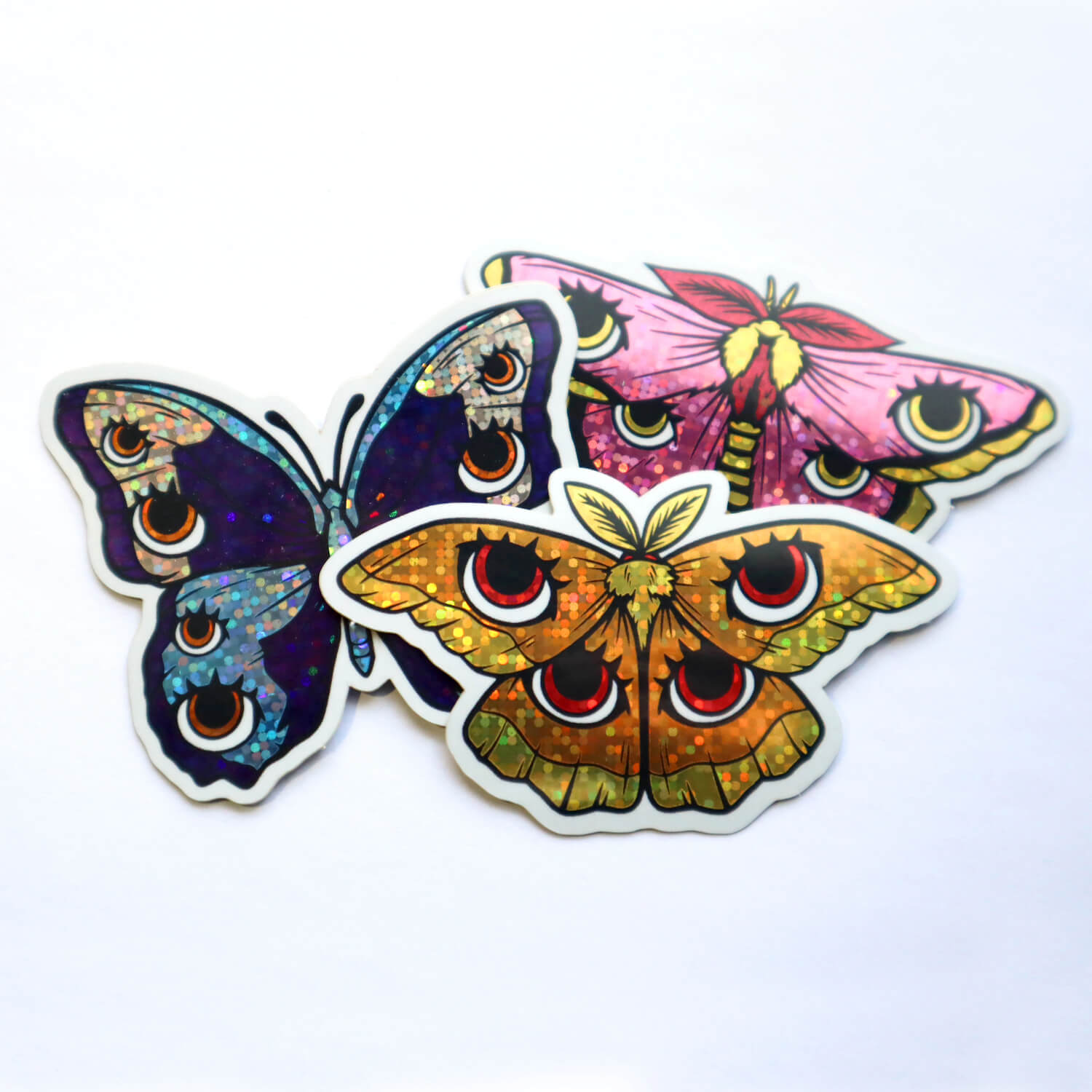 The Lepidoptera Panoptica glitter stickers are here and they are out of this world...step into an alternate dimension with these illustrious butterflies and moths, featuring glam eyespots with beautiful Twiggy-inspired lashes.