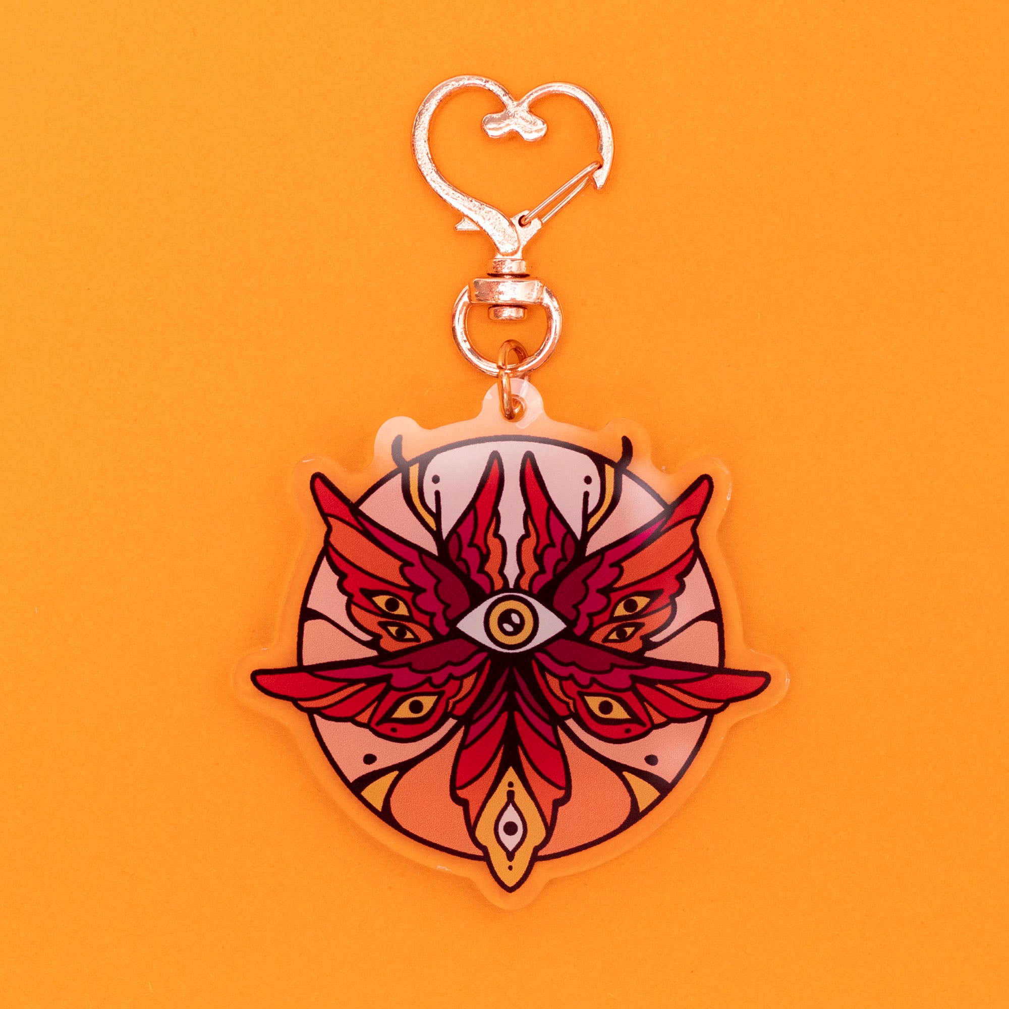 A butterfly-like seraph, for Lesbian pride.This acrylic keychain is 2.5 inches (6.3 cm) long, double-sided with the same print on both sides. The keychain has a rose gold heart-shaped clasp.Please note: the keychain comes with protective film that should be peeled off.