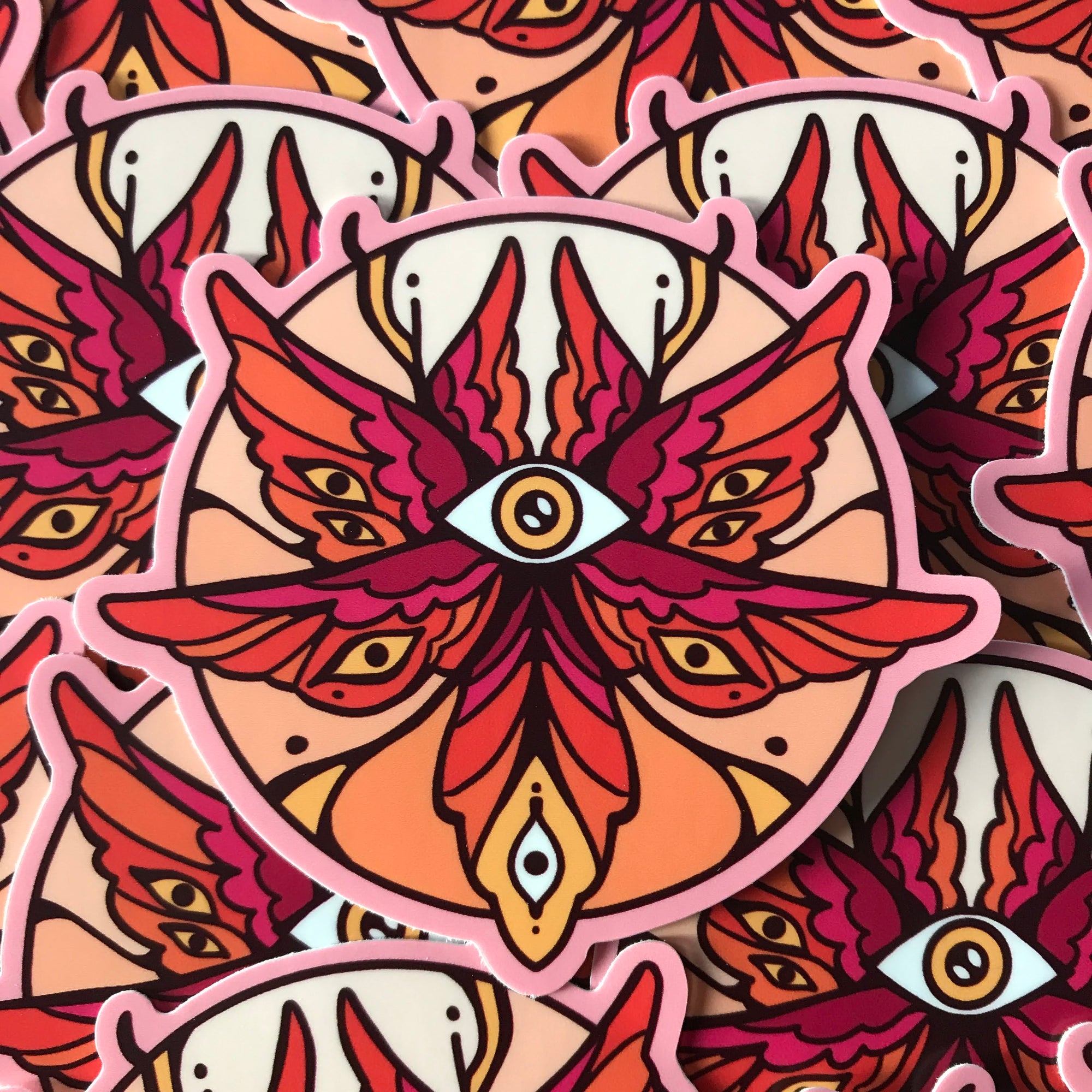 A butterfly-like seraph, for Lesbian pride. This sticker is approximately 3 inches (7.6 cm) on the longest side, and printed on matte vinyl.