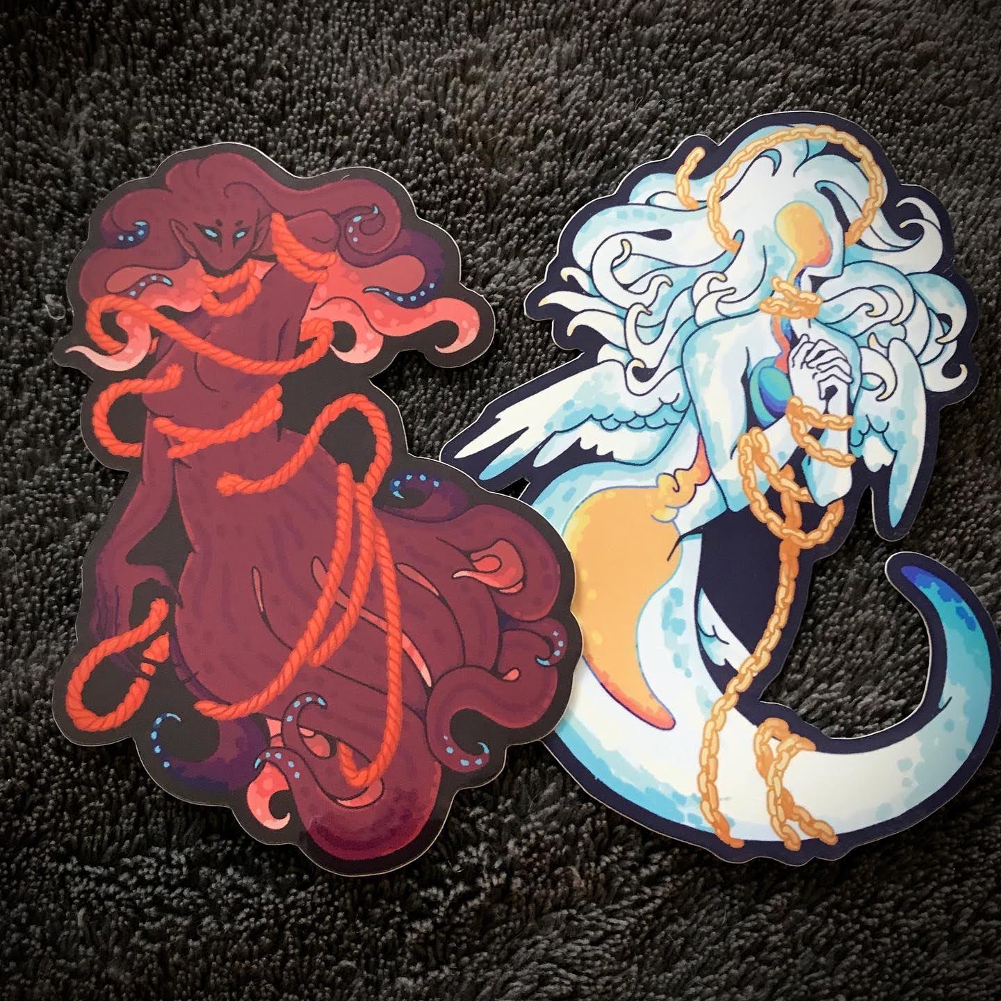 Pick one or both of these Mermay 2022 stickers! Each sticker is about 4 inches (10 cm) on the longest side. They feature foil accents and are printed on glossy vinyl. Sea Angel Mermaid An angelic mermaid bound with gold foil chains. Vampire Squid Mermaid A monstrous mermaid freeing herself from red foil ropes. Set of Two Stickers These mermaids were made to swim together. Get the pair and save some cash! These stickers were made in collaboration with Stickerapp.