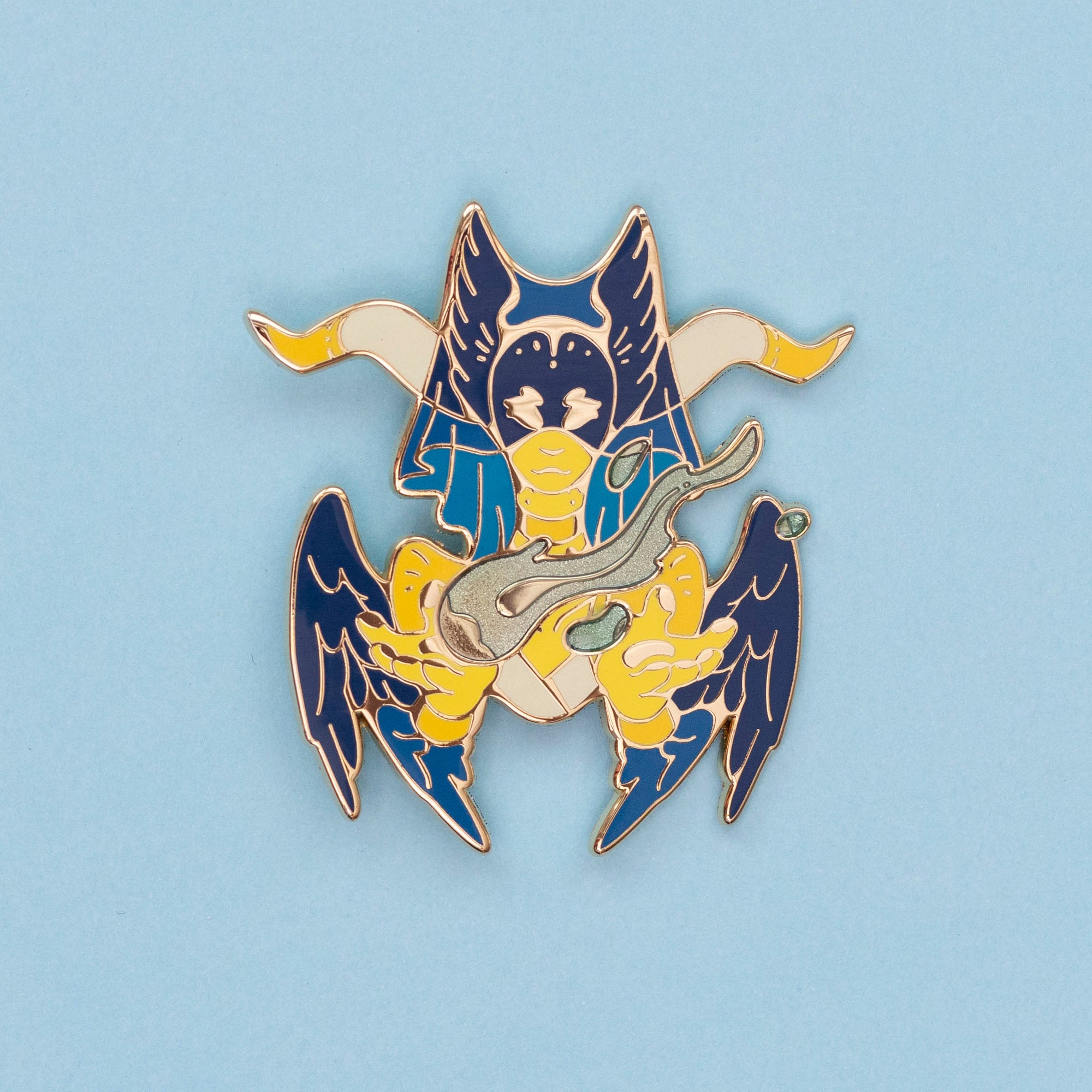 These pins are approximately 2 in (5 cm) wide, with two pin posts with rubber clutches. The Mistress of the Altar has hard enamel with transparent accents; and gold plating.