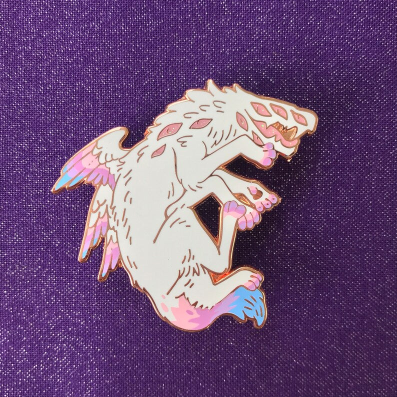 My original character Sam in his monstrous angelic hound form! He is full of teeth, eyes, and love. Sam is 1.7 in (4.5 cm) long, and features hard enamel, rose gold plating, recessed metal, and screen-printing. This listing is for standard grade pins only. Standard grade pins may have one or two tiny imperfections.