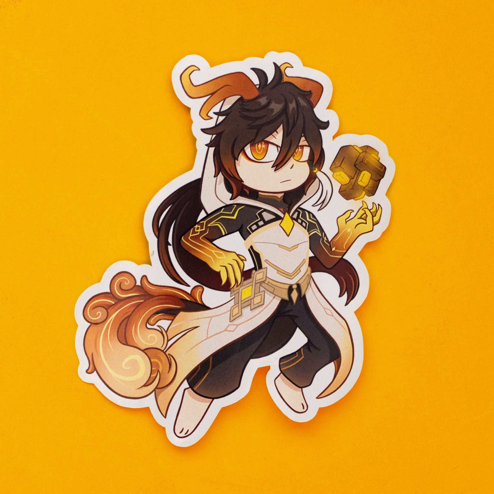 The Lord of Geo himself, Morax, now going by Zhongli, here in charm form to accompany you on your travels. In sticker form!