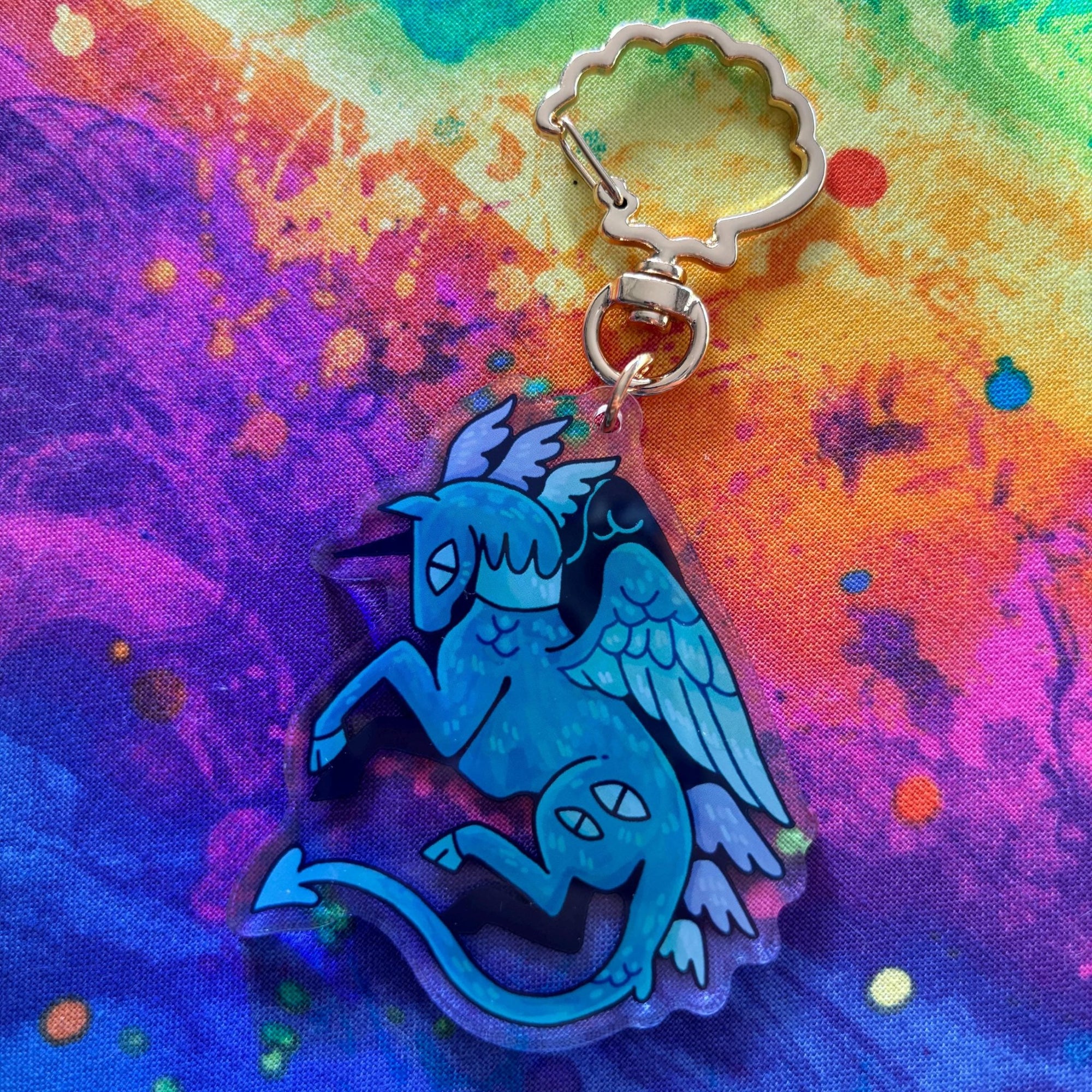 | This acrylic keychain is 2.5 inches (6.3 cm) on the longest side, double-sided with the same print on both sides; it has a gold shell clasp. |