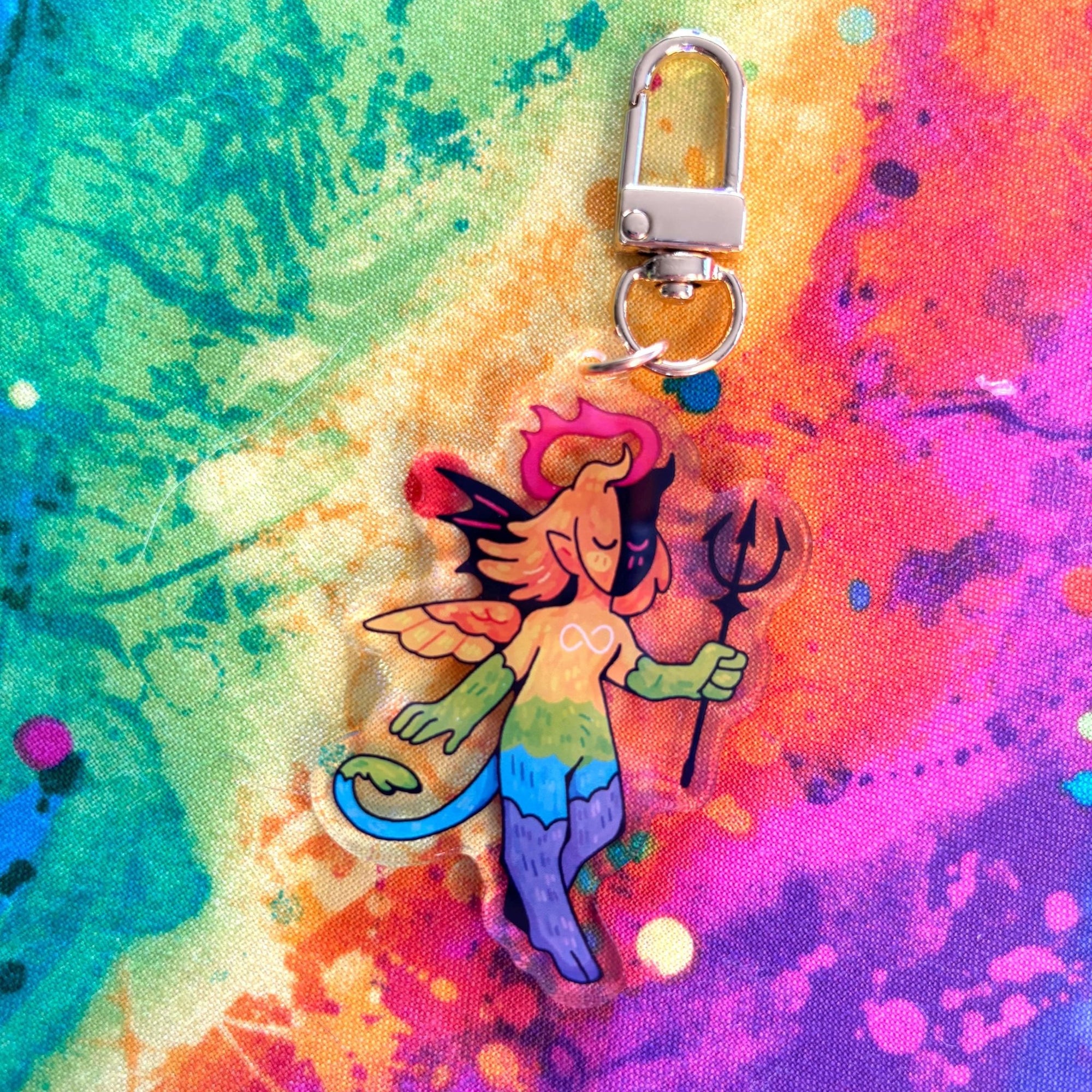 This acrylic keychain is 2.5 inches (6.3 cm) on the longest side, double-sided with the same print on both sides; it has a gold lobster clasp.