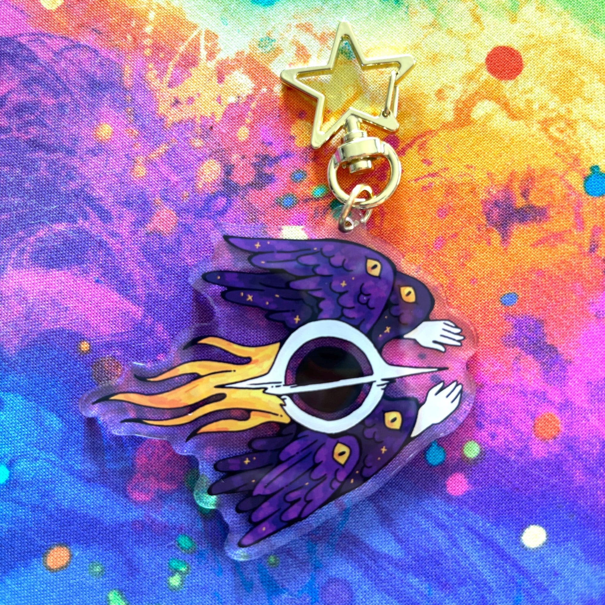 | This acrylic keychain is 2.5 inches (6.3 cm) on the longest side, double-sided with the same print on both sides; it has a gold star clasp. |