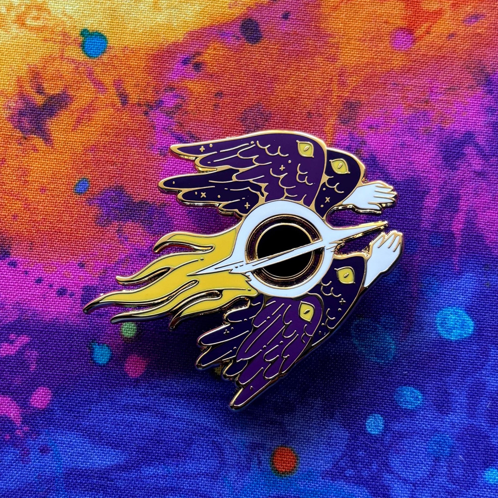 This pin is 2 inches wide with gold plating. It has hard enamel, two pin posts, and rubber backings.
