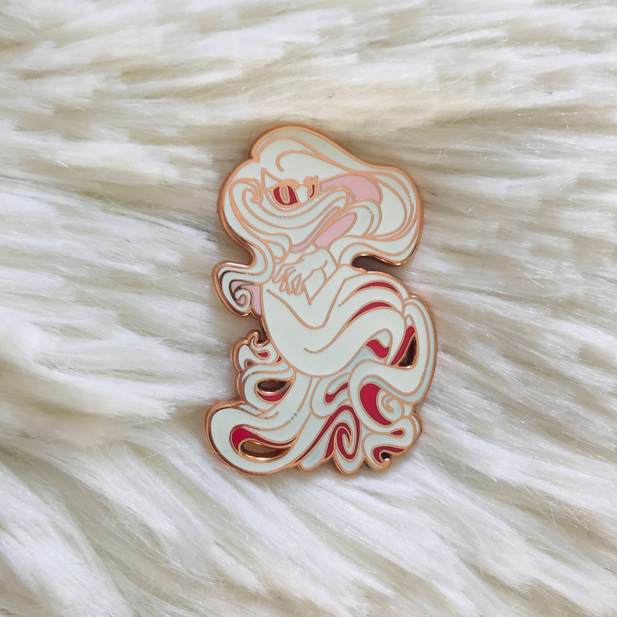 The octopus is an impressively intelligent mollusk. All octopuses are venomous! This pin is part of my unconventional mermaid pin series, Peculiar Mermaids. The pin is 1.7 inches (4.5 cm) long. It is rose gold plated with hard enamel, and has two pinbacks with rubber clutches. This listing is for standard grade pins only. Standard grade pins may have one or two tiny imperfections.