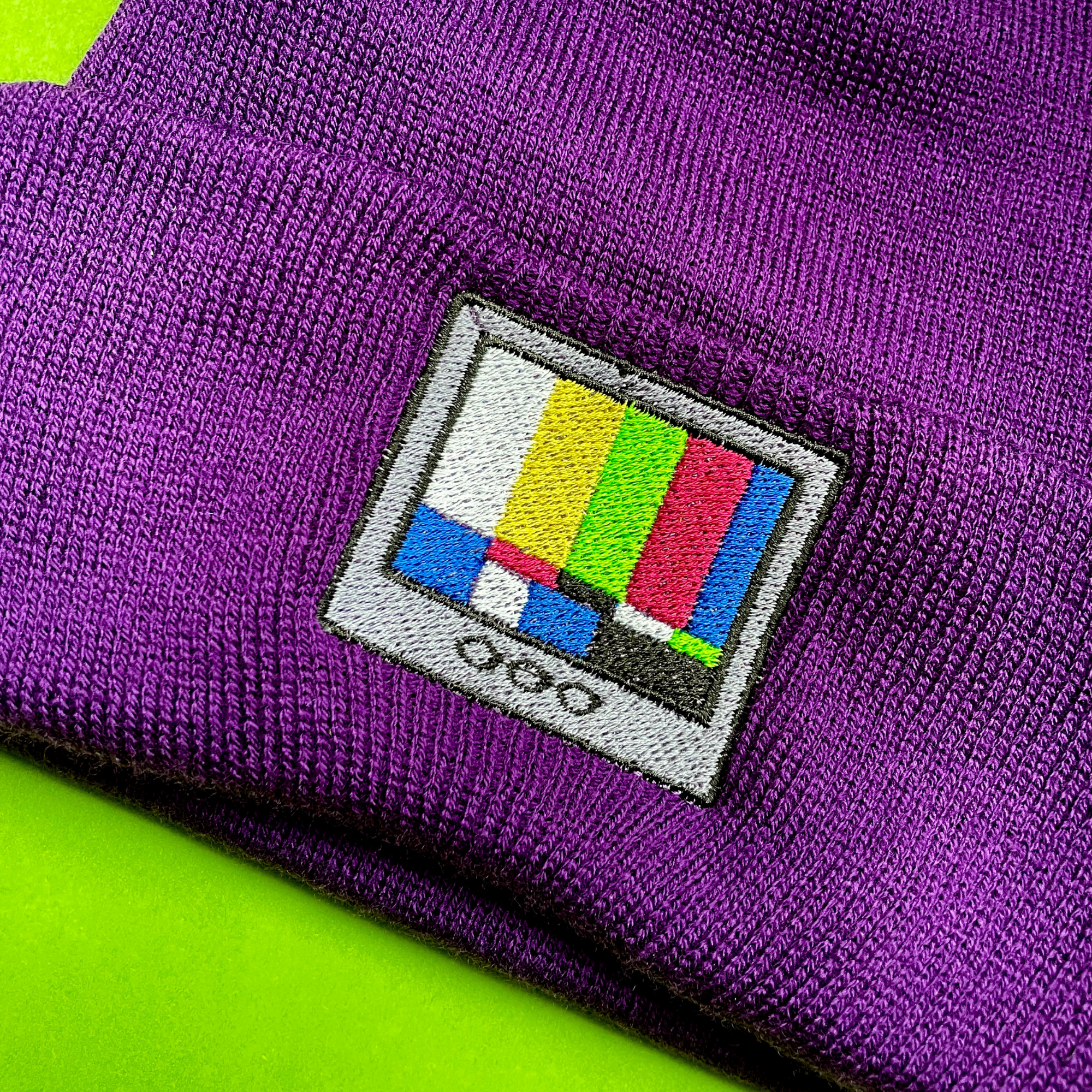 These cozy beanies are super soft and are meant to be worn in a folded style. The front features a homemade embroidered OFF-AIR Glitched TV design. These roomy beanies are stretchy and accommodating for almost any head size! One of our first ever designs, its returning favorite for all of your glitchcore needs!