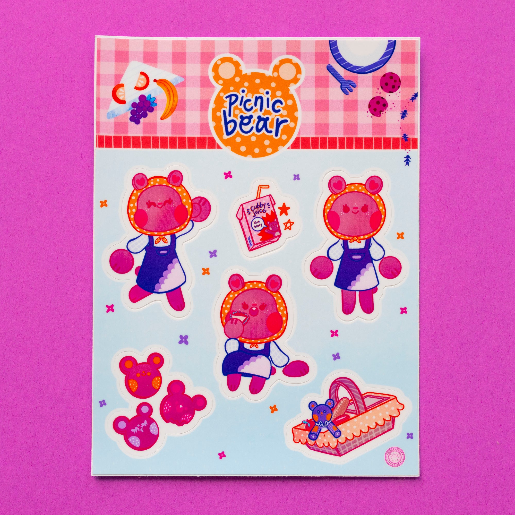Meet Picnic Bear, the friendliest gal around! She loves snacks and making friends! Have a lovely, picnic-afternoon with this cute lil' sticker sheet! It comes with 6 colorful and gloss-covered stickers, ranging anywhere between 25.4mm to 50.8mm in size! Each sticker comes cut-to-shape (die-cut) and coated in a glossy sheen!