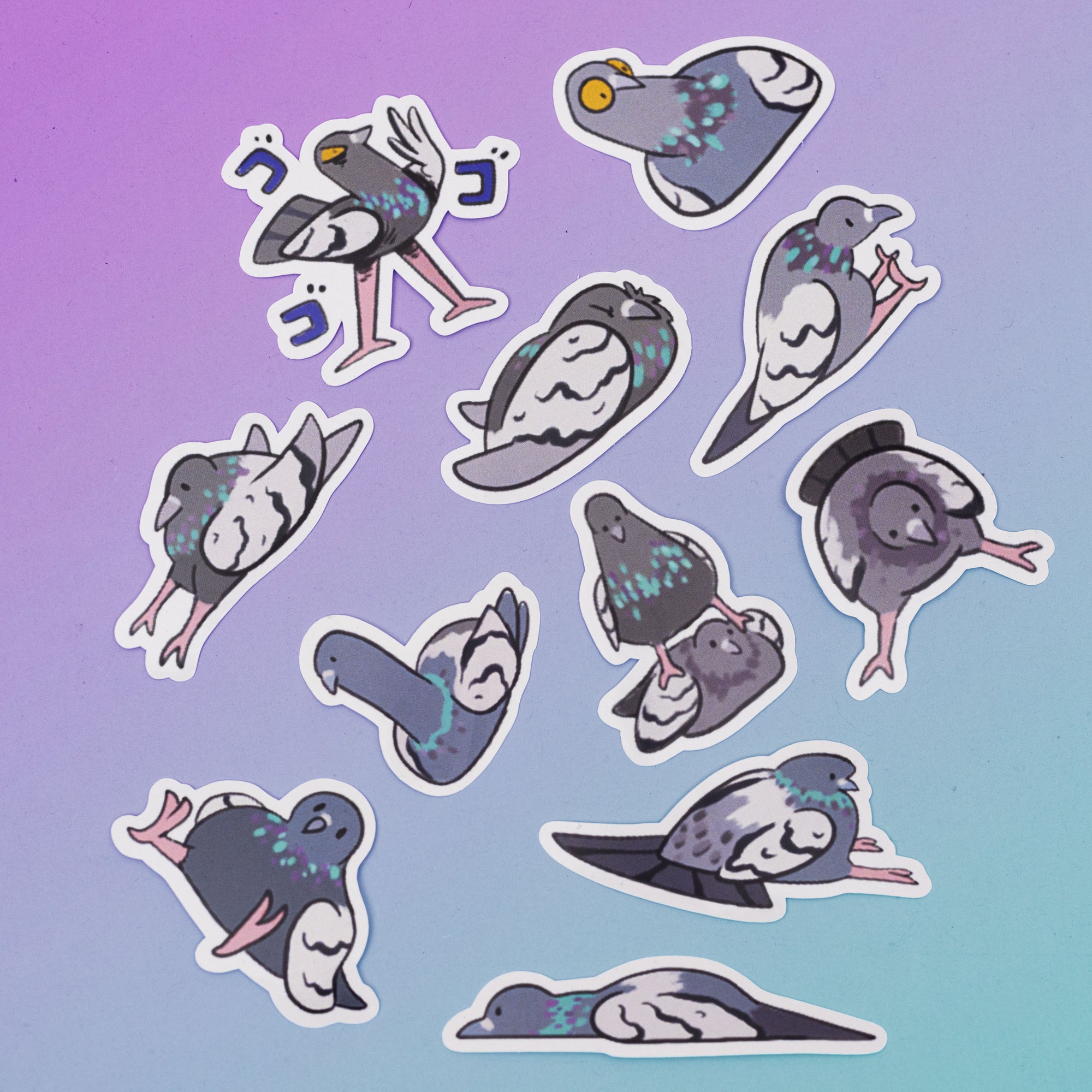 An assortment of pigeons sitting and standing in various stances, asserting their authority. This set includes a total of 11 stickers.