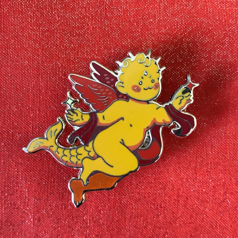 A little putto (cherub) for the constellation Pisces.Each pin is about 2 inches (5 cm) wide with hard enamel, gold plating, and screenprint. They have two pin posts and rubber backings.This whole batch was flawed so they are discounted. For my complete pin grading policy, please see my About & FAQ: linktr.ee/ultra.infinite