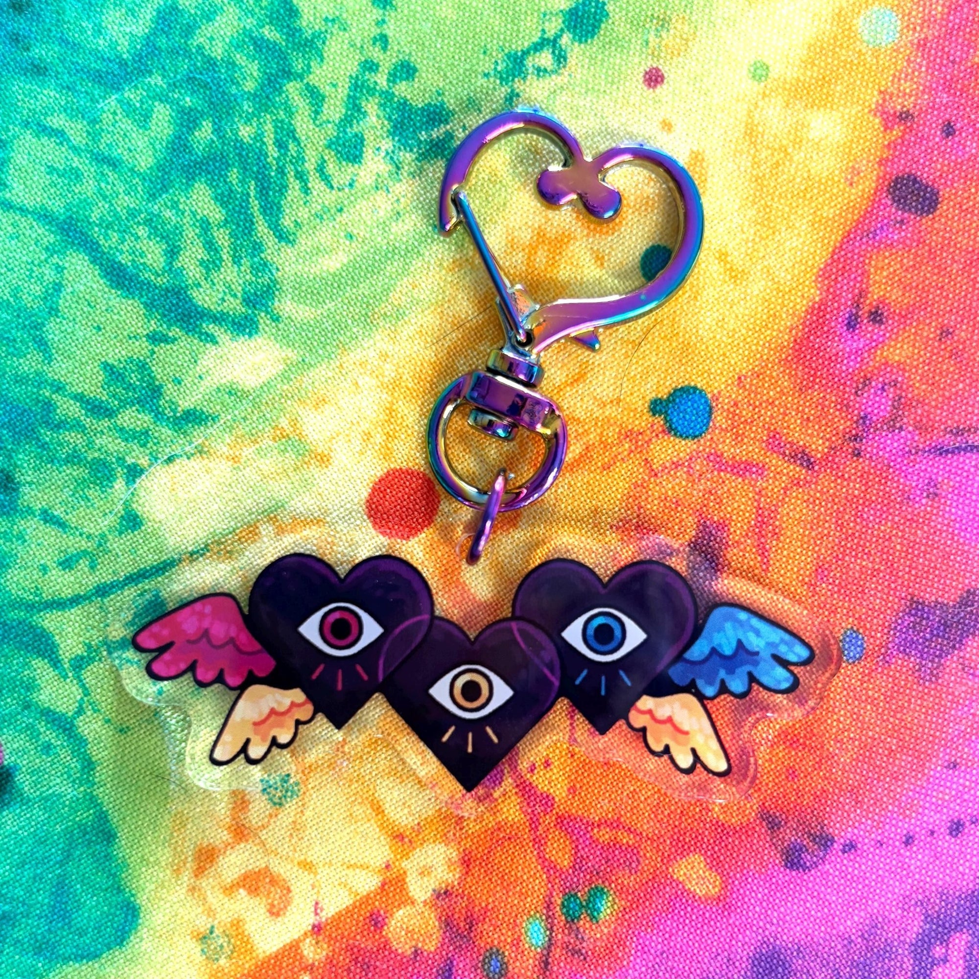 | This acrylic keychain is 2.5 inches (6.3 cm) on the longest side, double-sided with the same print on both sides; it has a rainbow heart clasp. |