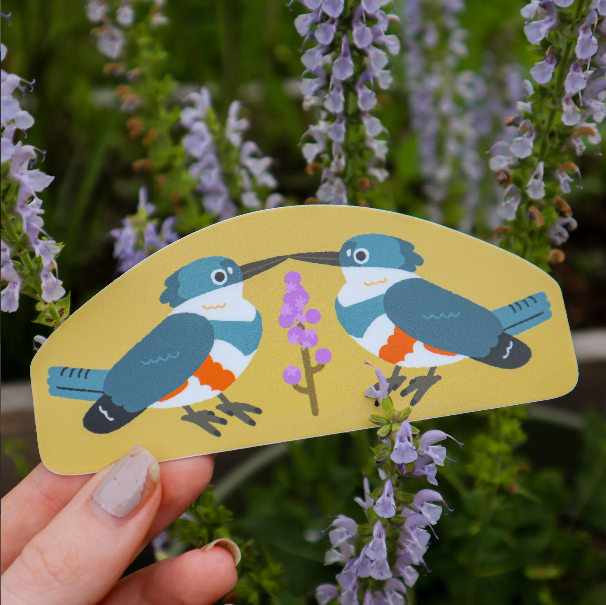 subtle birdy pride stickers for all your queer nature nerd needs. 3" vinyl sticker with a pair of lavender lover belted kingfishers