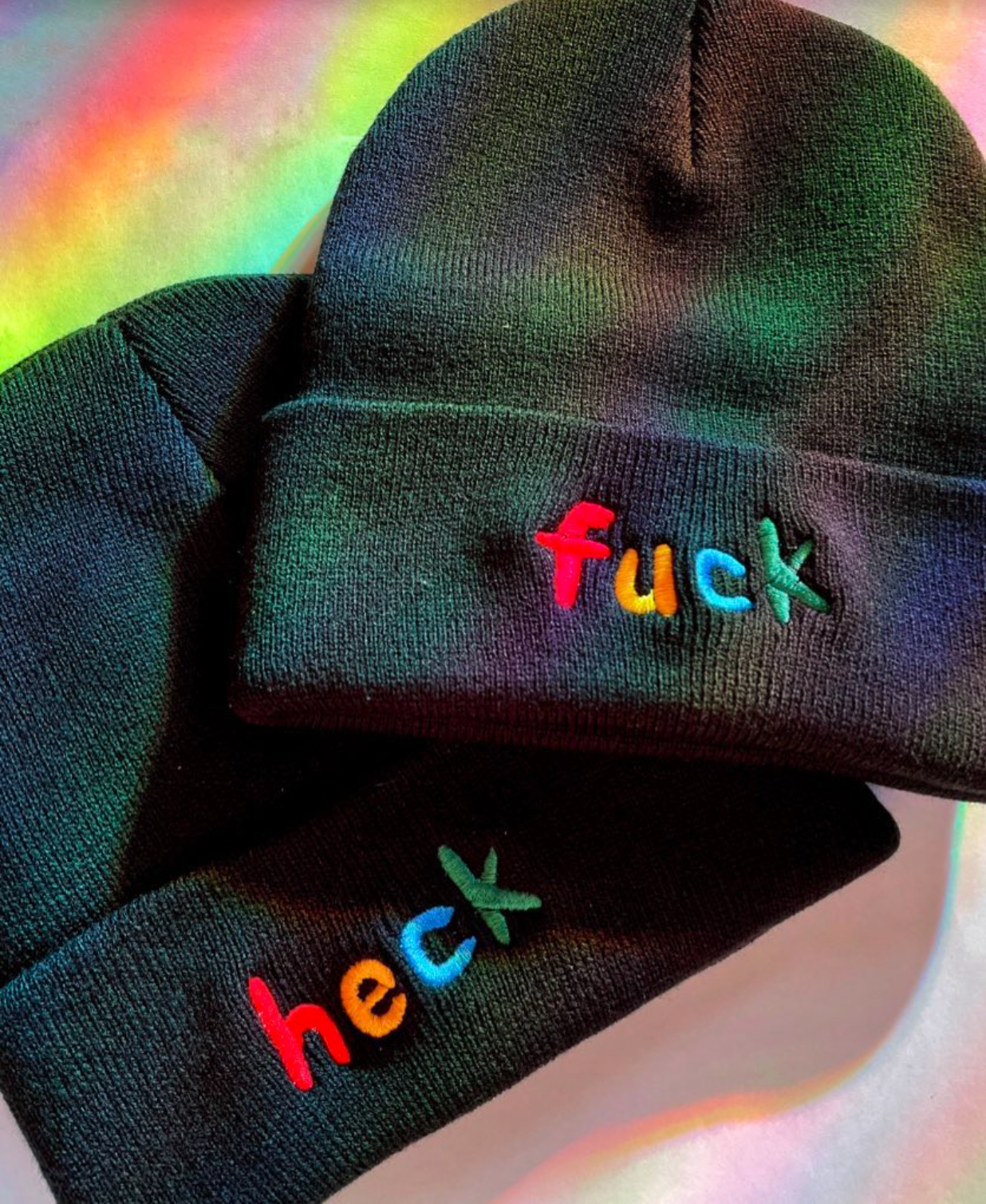 These cozy beanies are super soft and are meant to be worn in a folded style. The front features a homemade embroidered profanity design in two variations. These roomy beanies are stretchy and accommodating for almost any head size! A silly beanie that's a fan favorite and certainly a conversation starter!