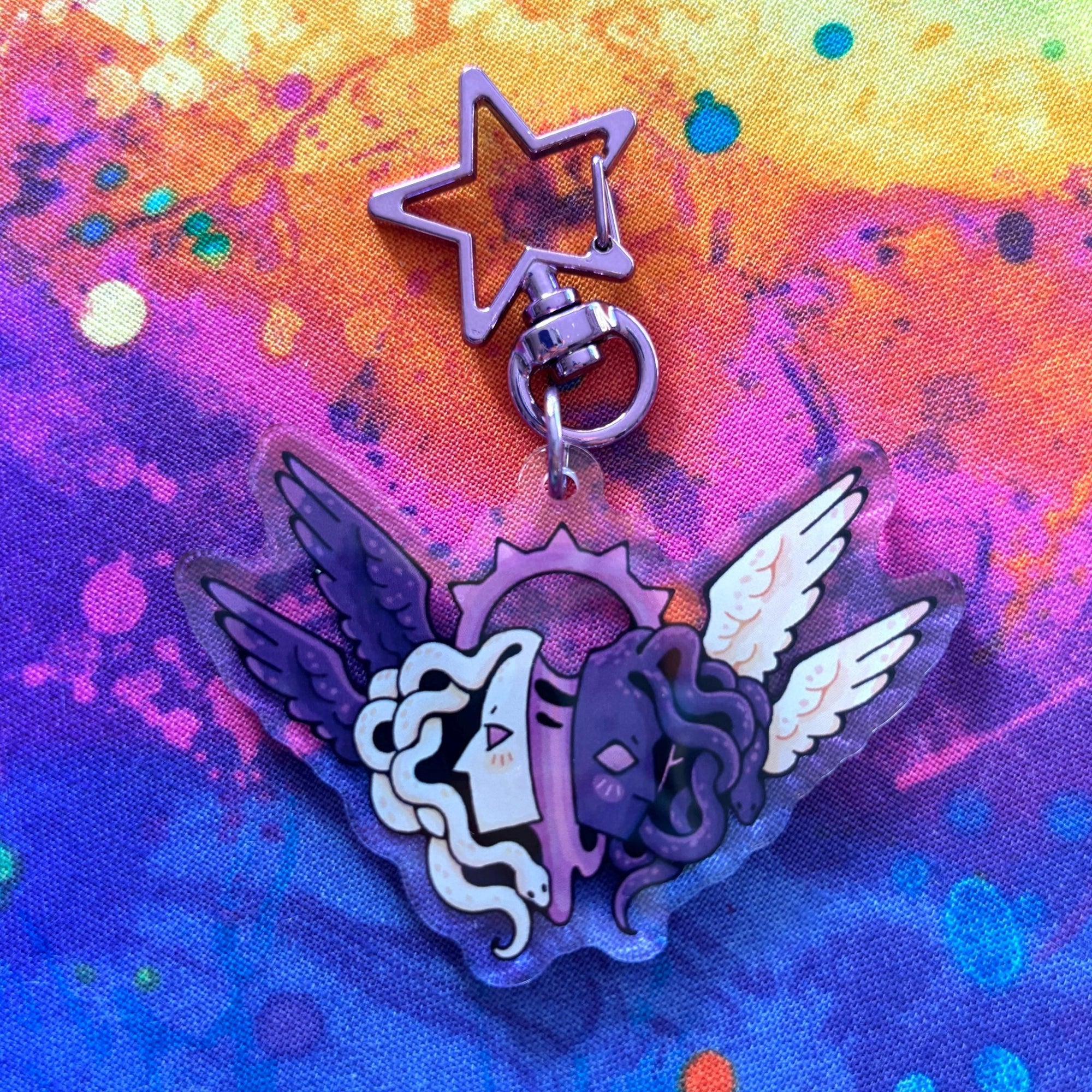 | This acrylic keychain is 2.5 inches (6.3 cm) on the longest side, double-sided with the same print on both sides; it has a purple star clasp. |