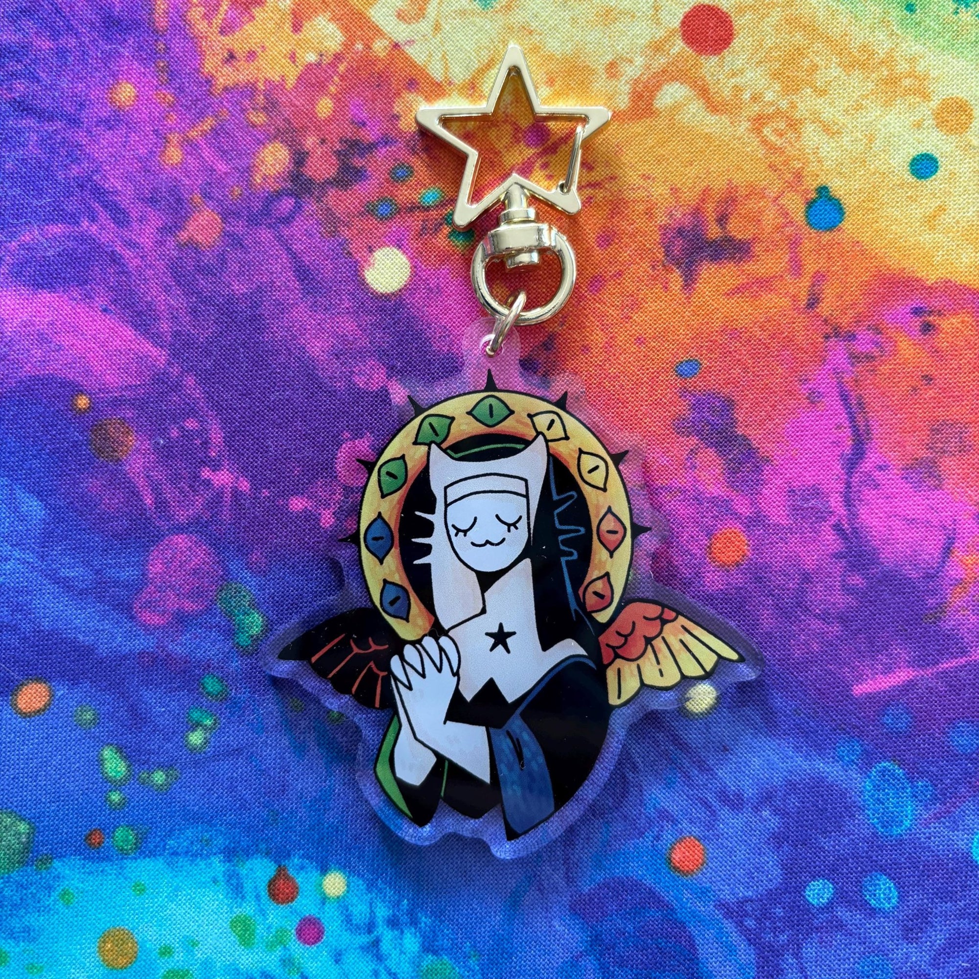 | This acrylic keychain is 2.5 inches (6.3 cm) on the longest side, double-sided with the same print on both sides; it has a gold star clasp. |