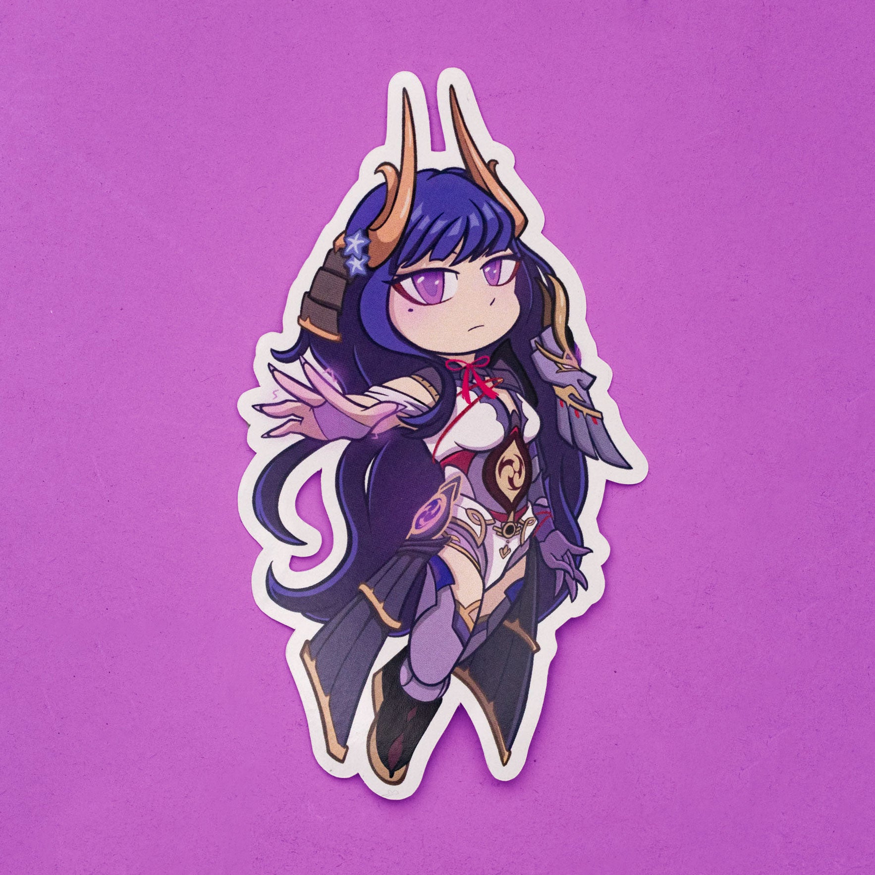 The Mighty Raiden Shogun, though more privately refered to as Ei, accepts any challange from any daring traveller. In sticker form!