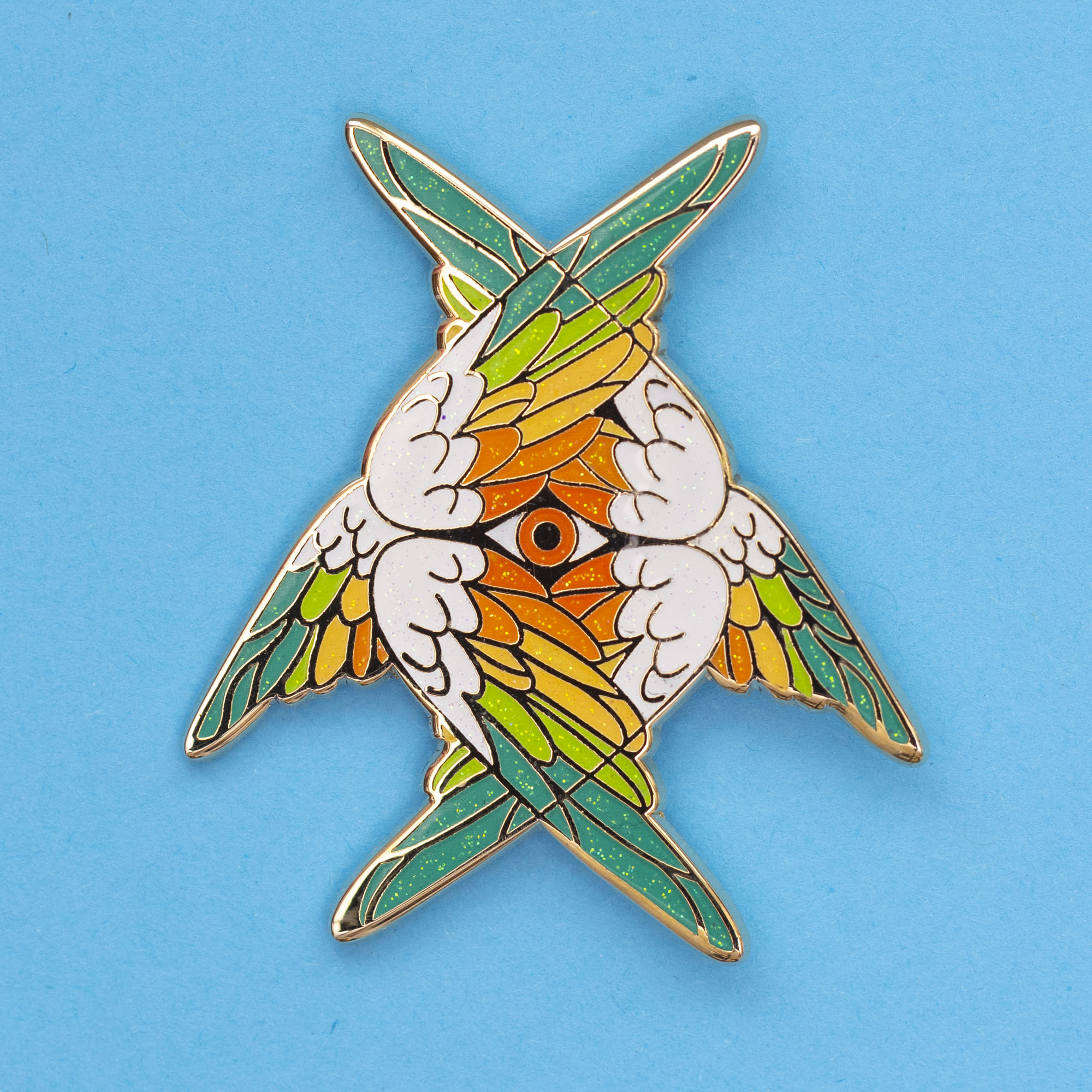 This pin is part of my angel-themed pin series, Angelology. A colorful guardian angel of love in all its forms, Heart Seraphim features wings folded into heart shapes and a single eye.