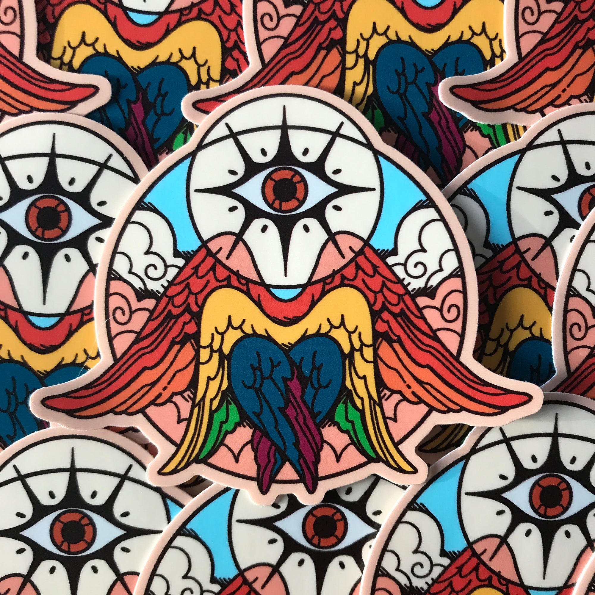 A many-winged rainbow angel, for Rainbow/Progress Pride. This sticker is approximately 3 inches (7.6 cm) on the longest side, and printed on matte vinyl.
