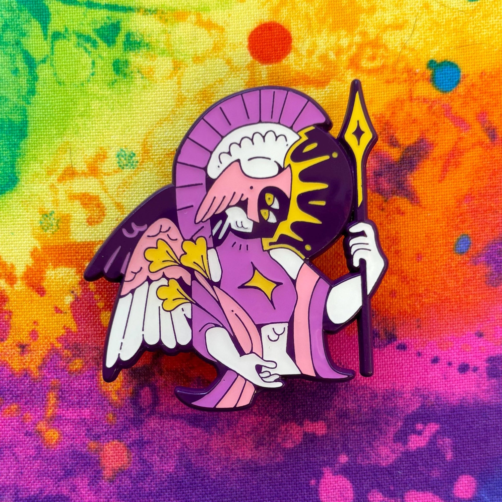 | This pin is 1.8 inches long with dyed metal plating, soft enamel, and epoxy. It has two pin posts with rubber backings. |